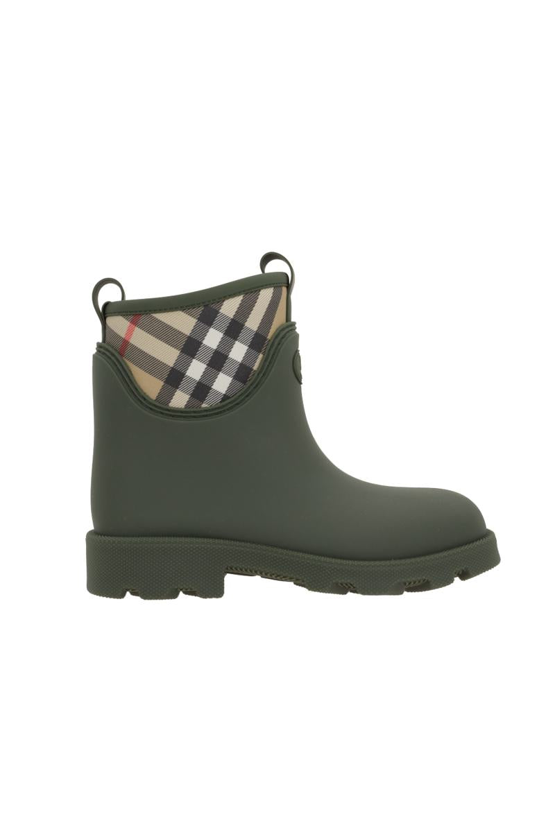 Burberry rain boots crafted from dark green rubber with a nylon insert featuring the Burberry Check print. Characterized by a round toe, fabric linings, and a rubber sole. The design is completed by the embossed Equestrian Knight Design detail on the front.