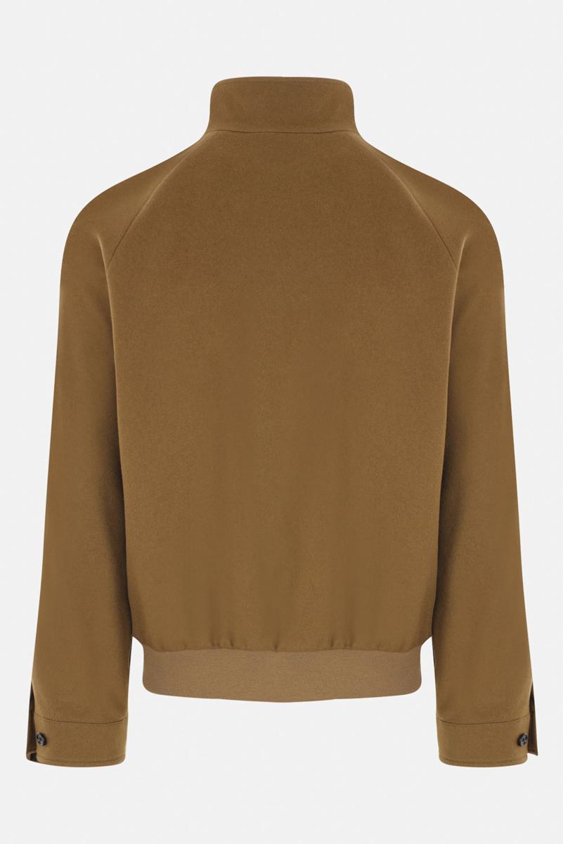 Burberry's bomber jacket crafted in light brown cashmere cloth with Equestrian Knight Design embroidered at chest. It features high neck, double-slider zip closure, welt pockets, long sleeves with buttoned cuffs and ribbed knit edges. Burberry Check cotton lined interior.