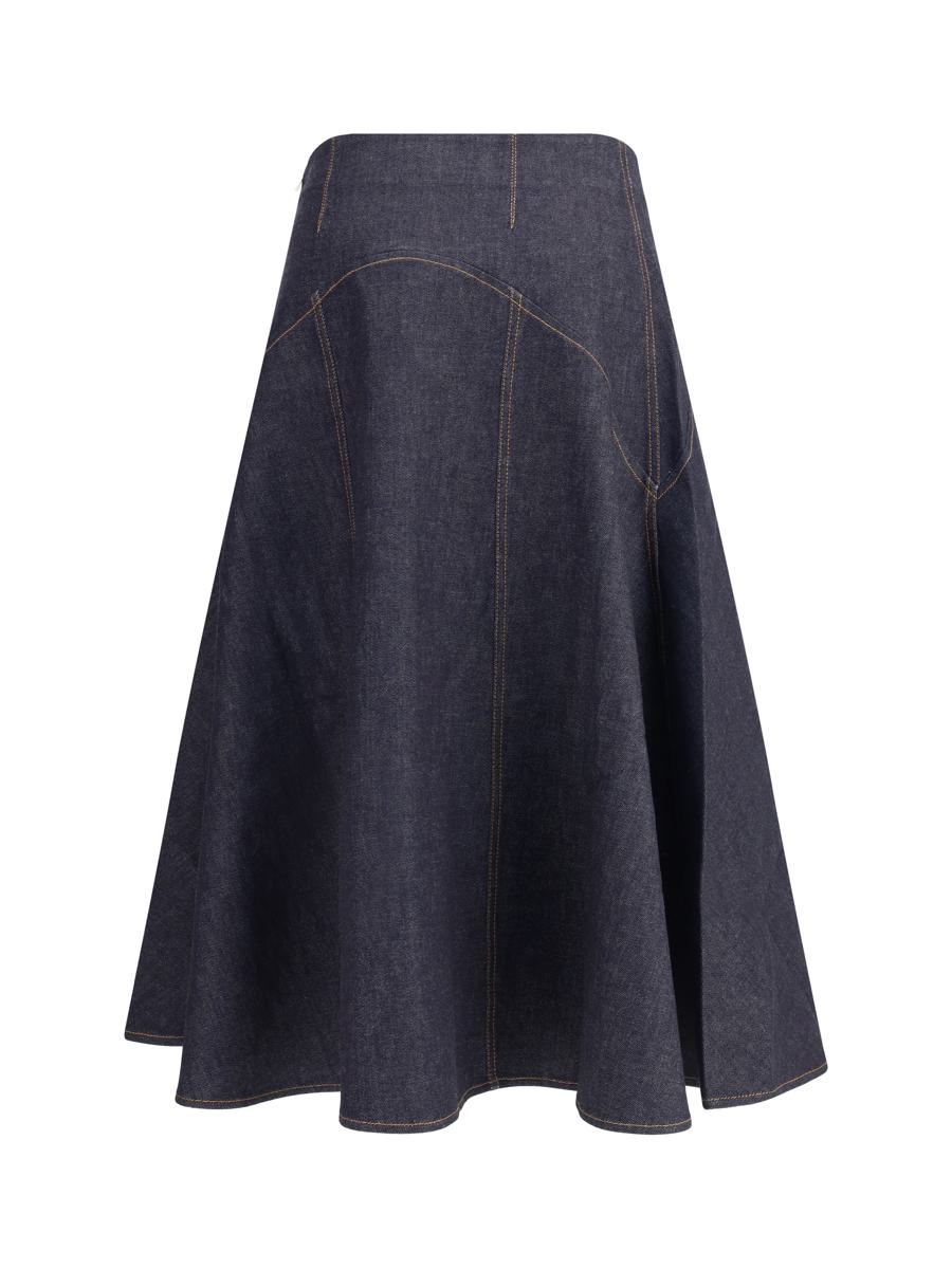 THE DENIM MIDI SKIRT FROM JACQUEMUS IS A FLARED DESIGN WITH CONTRAST STITCHING THAT ENHANCES ITS STRUCTURE. FEATURING 'J' EMBROIDERY ON THE SIDE AND A SIDE ZIPPER CLOSURE, IT COMBINES A DISTINCTIVE TOUCH WITH A VERSATILE, CONTEMPORARY DESIGN.