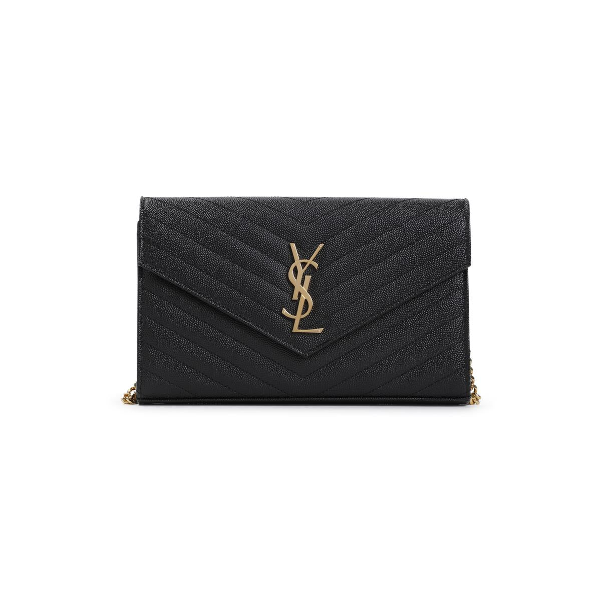 Saint Laurent Black Matelasse Grained Calf Leather YSL Chain Wallet. Pure black Matelasse grained calf leather wallet, front gold-tone metallic signature YSL detail, front flap fastening, top chain shoulder strap, inner gold-tone lettering logo, inner zipped pocket, inner 8 card slots, one bills compartment, gold-tone hardware.