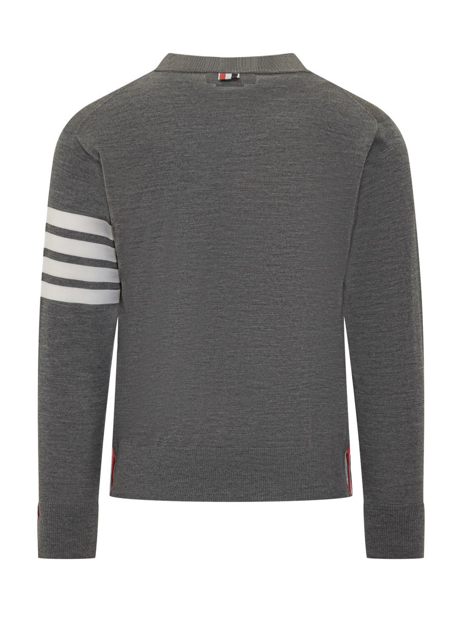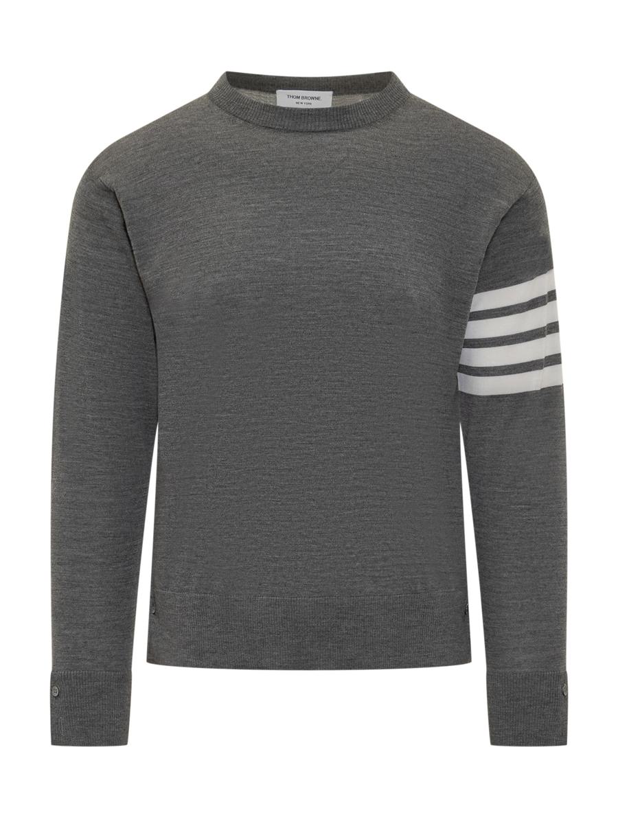 Thom Browne crew-neck sweater in gray wool with iconic four white bands on the sleeve.