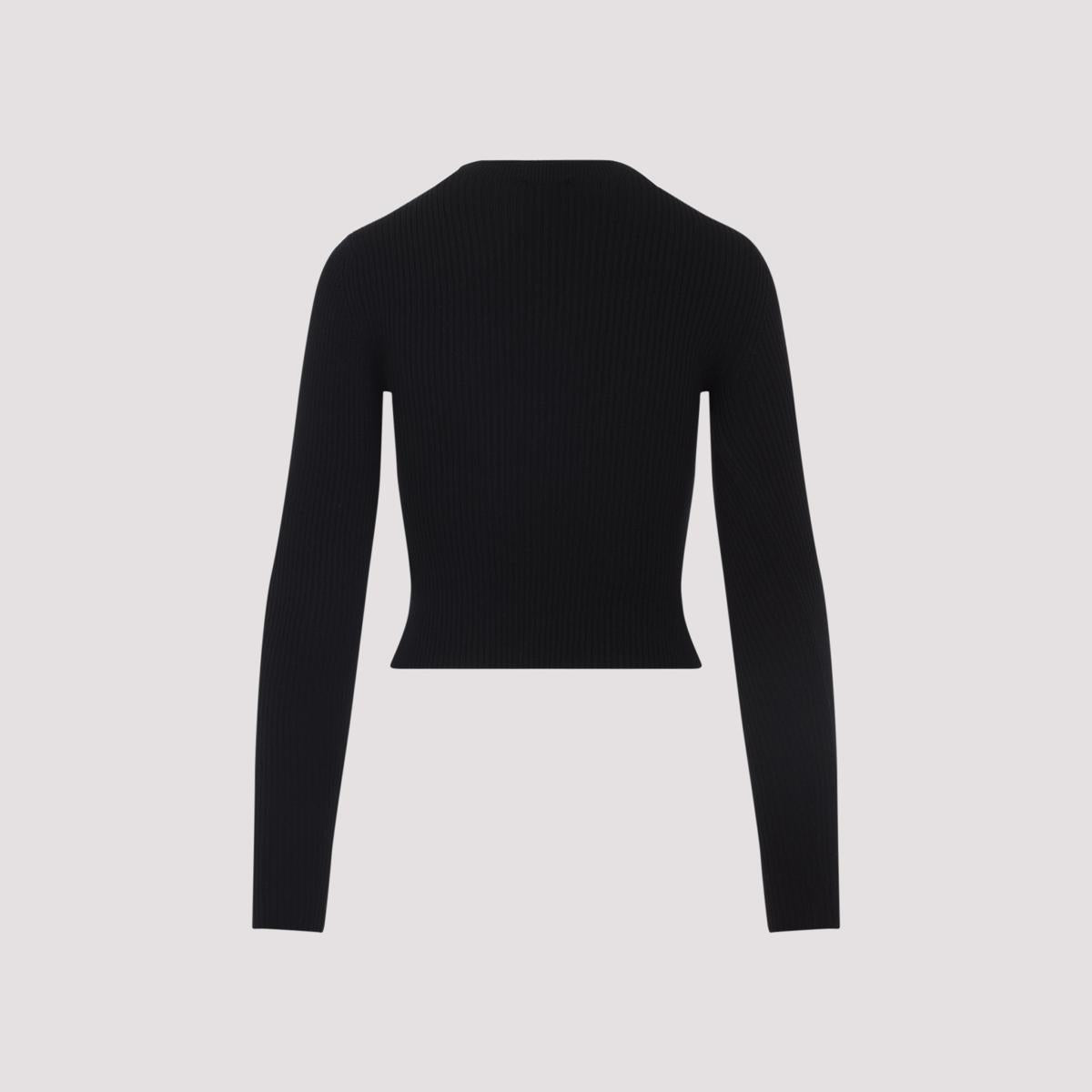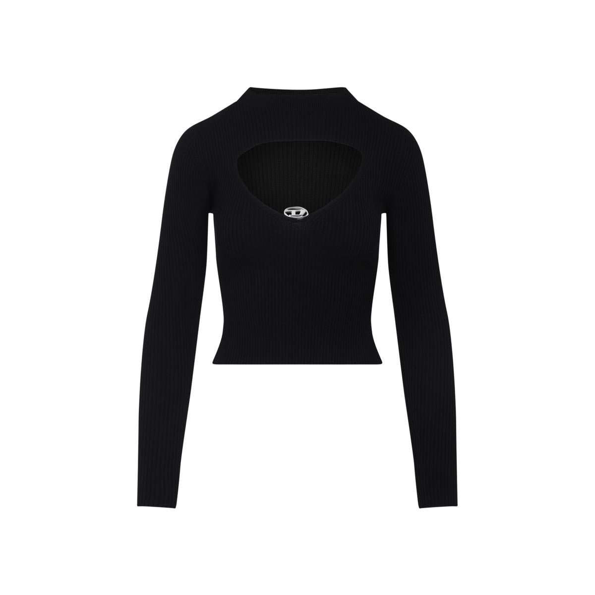 Diesel M-olina Black Wool Top. Crafted from black ribbed wool, mock neckline, front cut-out with silver-tone metal logo plaque detail, long sleeves, cropped length, straight hem.