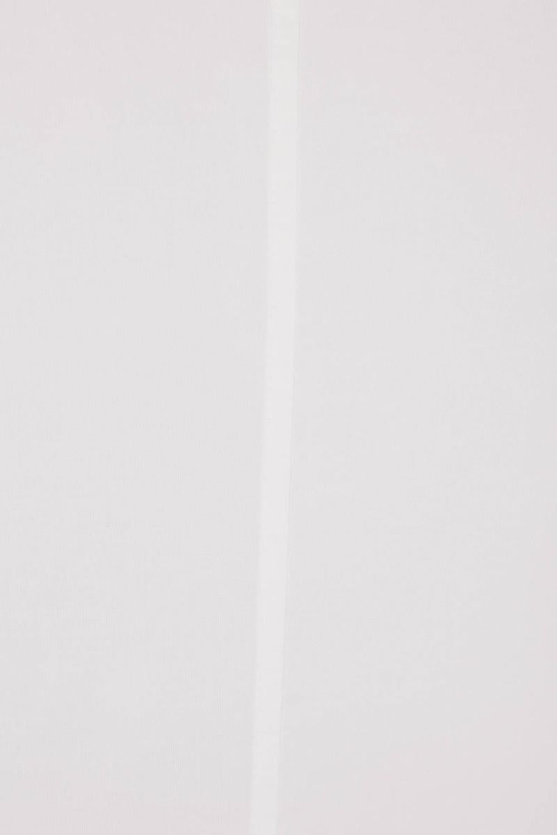 Yohji Yamamoto shirt crafted from white muslin. Features a classic collar, button closure, long sleeves, deconstructed cuffs with buttons, and a rounded hem with draping on one side.