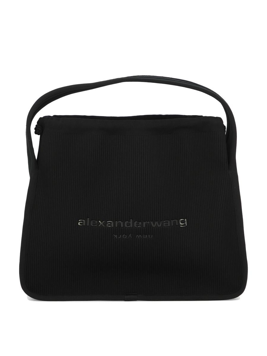 Alexander Wang medium "Ryan Large" shoulder bag made of synthetic materials features a soft structure with a wide silhouette. The model includes a fixed-length handle and a top drawstring closure. A single unlined main compartment defines the interior, while the front surface houses the printed logo. Construction elements focus on clean, minimal lines with clearly visible functional details.