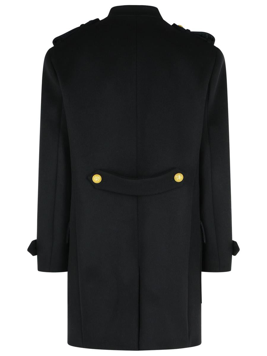 Official style collar, structured shoulders, shoulder straps with buttons and loops, long sleeves with strap and button, 4-button closure engraved under the flap, removable plastron with 10 buttons, two side flap pockets, martingale with buttons on the back, gold metal 'Leone catena' buttons, 'PB' labyrinth monogram lining, straight midi fit