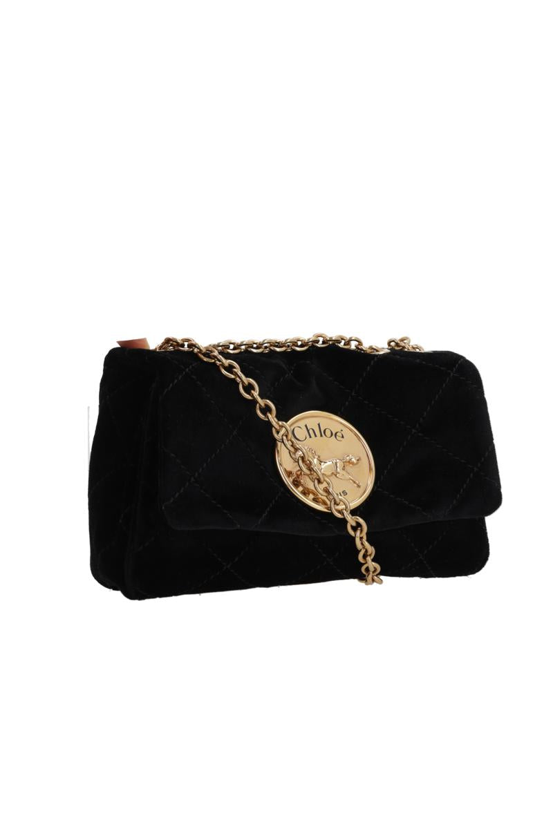 Chloé shoulder bag crafted in black quilted velvet. Featuring gold-tone hardware, a magnetic button closure on the flap, and an adjustable chain shoulder strap with two lengths. The interior, lined in black leather, includes a flat pocket. The design is completed with the signature Horse Medal metal detail.
