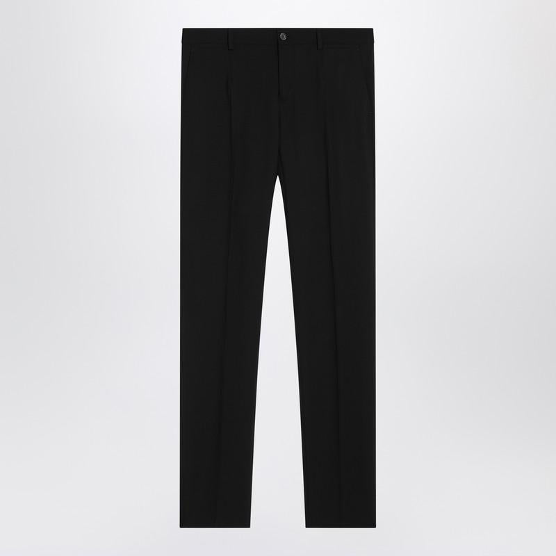 Black virgin wool single breasted suit by Dolce & Gabbana. Jacket featuring front button fastening, one welt chest pocket, long sleeves, two front flap pockets and back vent. Straight leg trousers featuring front zip and button fastening, belt loops at waist, two welt side pockets and two welt back pockets with button.