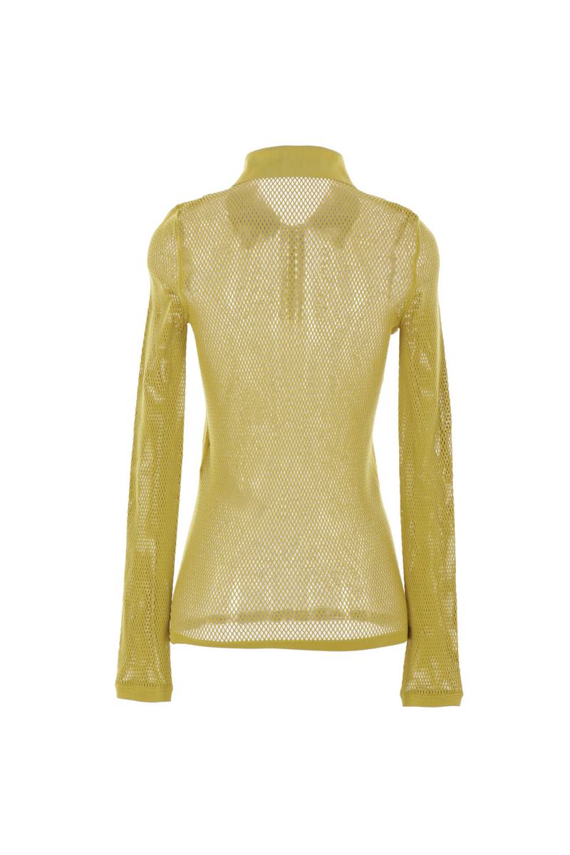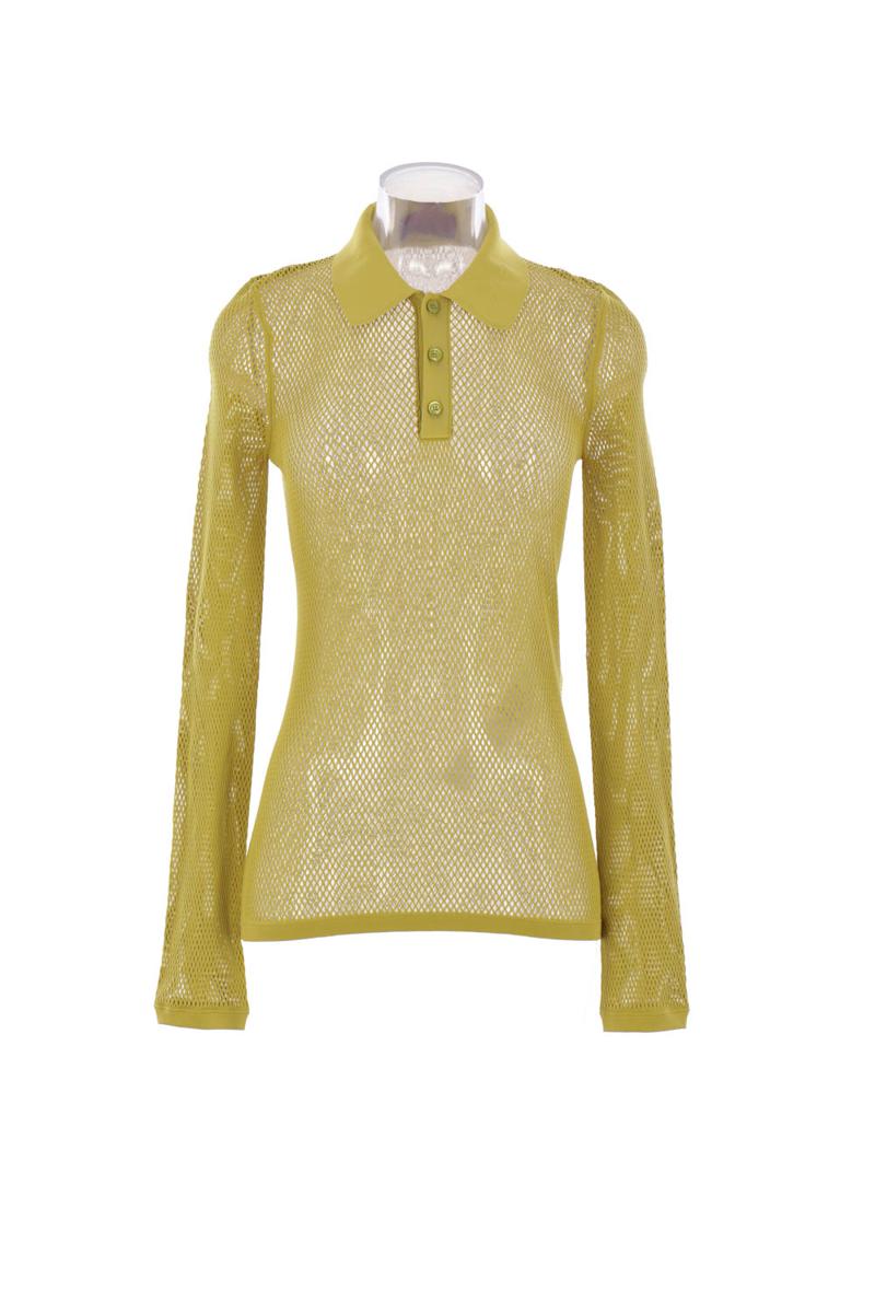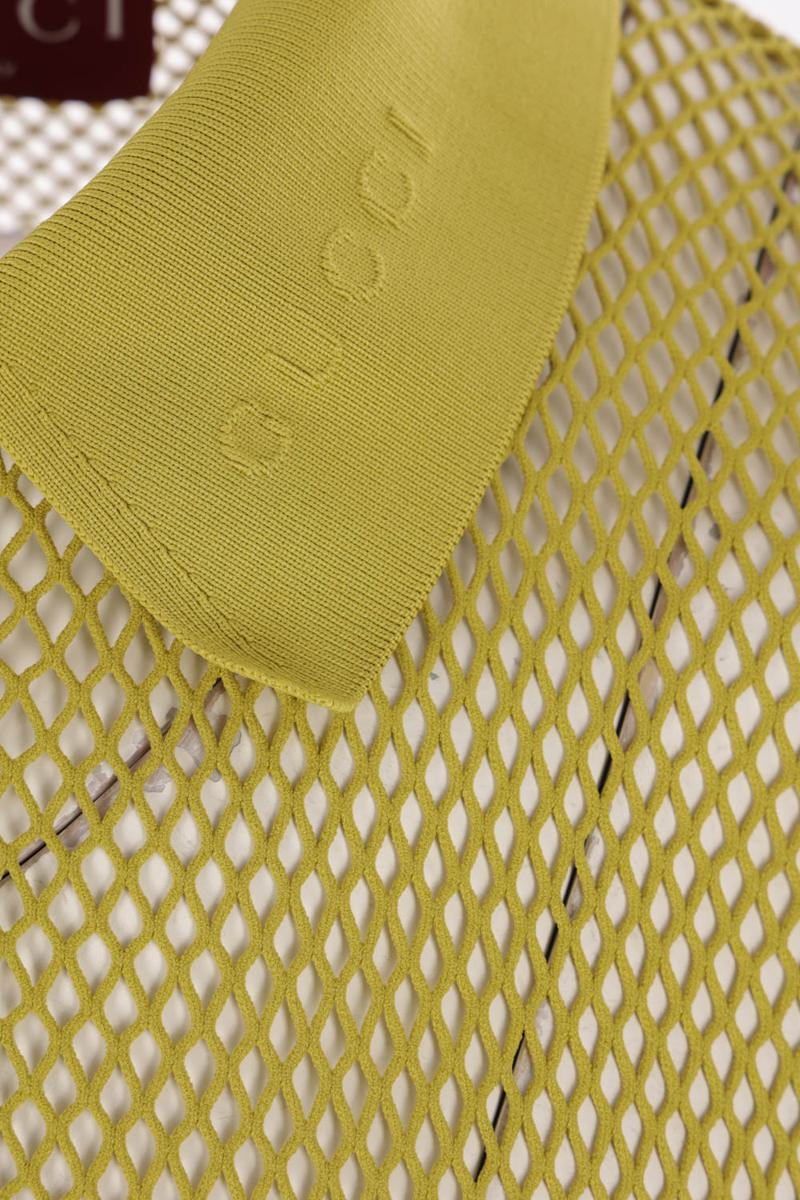 Gucci polo shirt made of pistachio green embossed technical mesh. Featuring a polo collar with embossed logo lettering, three-button placket, long sleeves, and a straight hem.