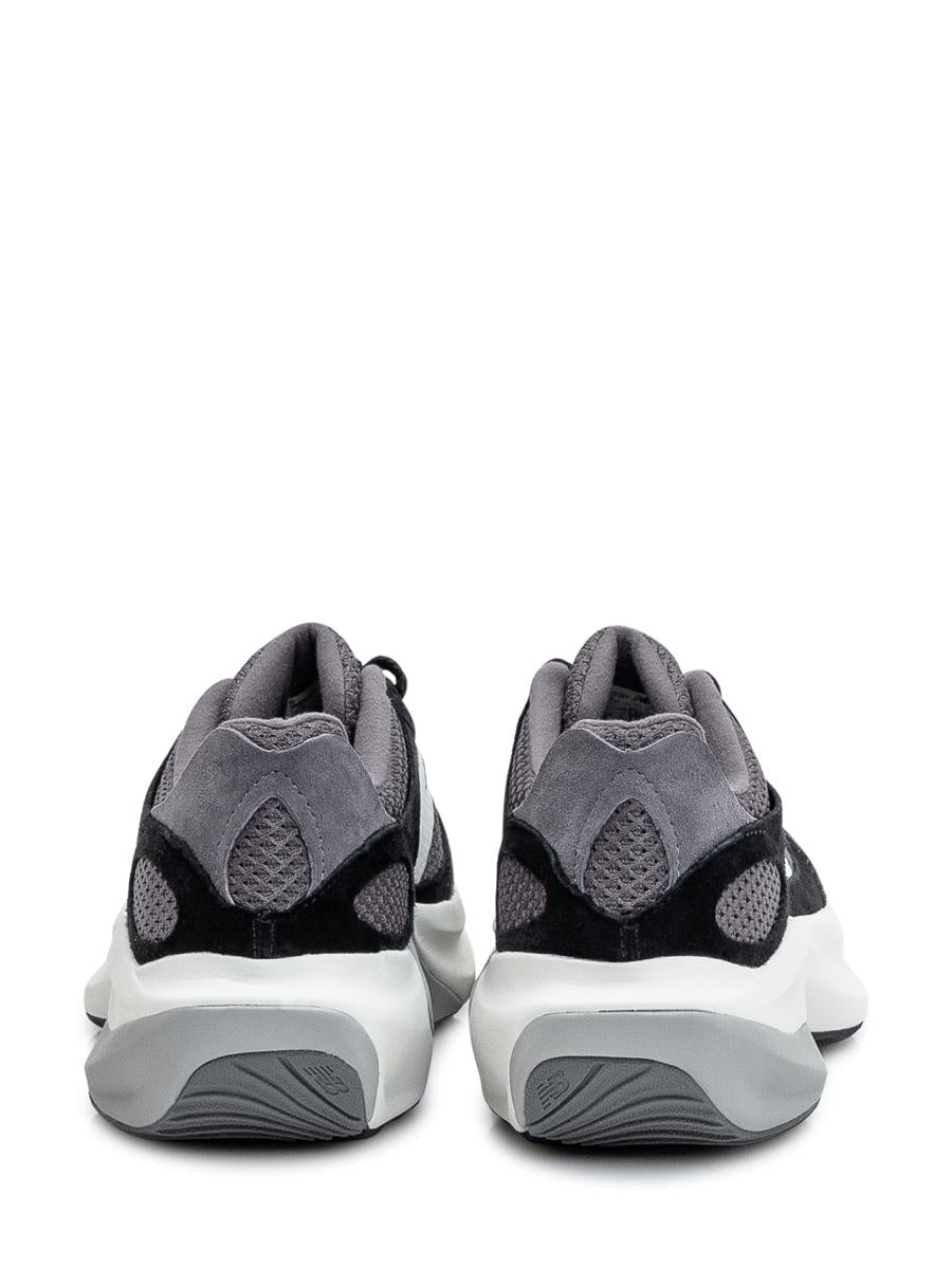 Lightweight shoe with welded TPU N logo. Outsole with sculpted, wavy tread pattern. Mesh, suede and mesh upper.