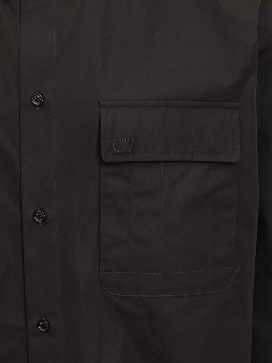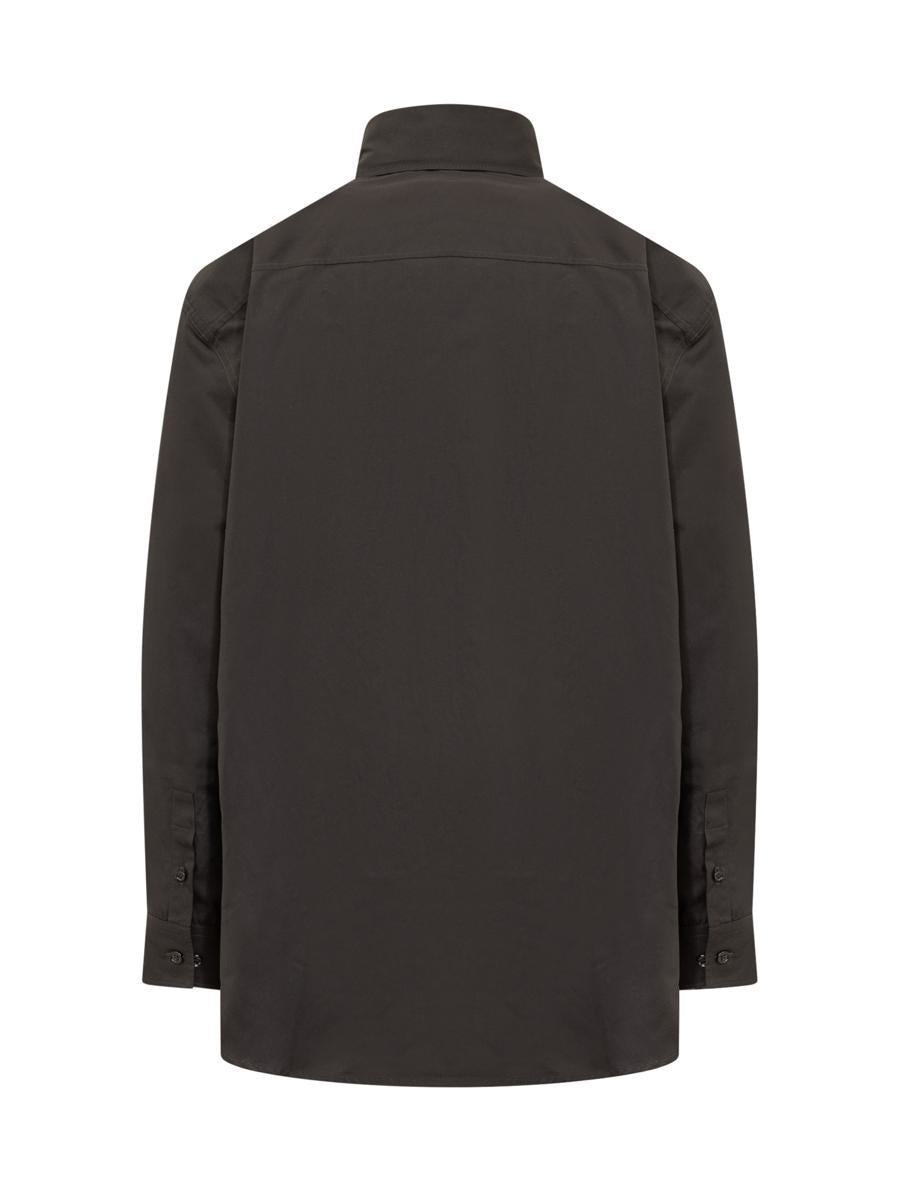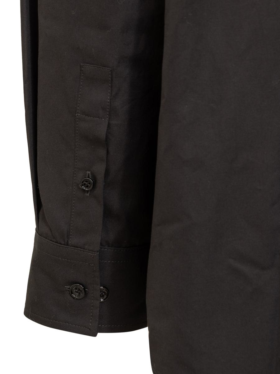 Black long-sleeved shirt. Front button closure. Chest pockets. Buttons at cuffs.
