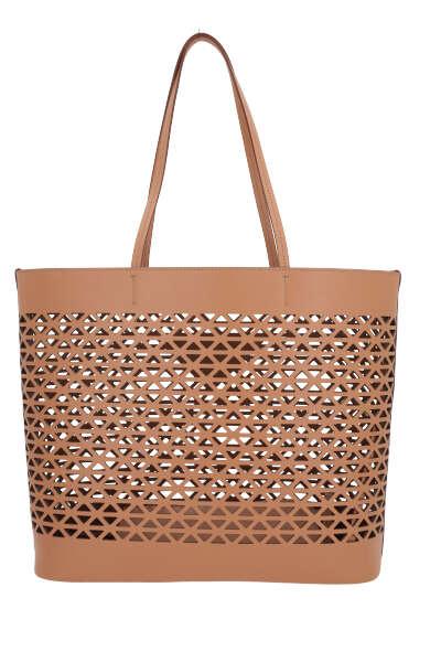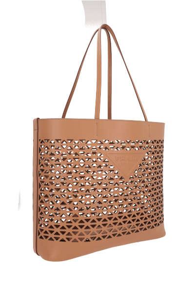 Prada's shopping bag crafted in light brown laser-cut leather with geometric motif. It features gold-tone hardware, double handle and unlined interior with matching zipped pouch. The design is completed by the unmistakable raised triangle logo on front.