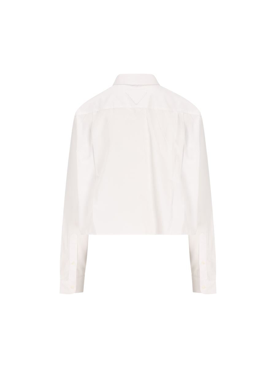 This Prada cropped shirt reinterprets a classic garment with a contemporary twist. Made of cotton poplin, it is distinguished by its bow collar, short cut and structured silhouette. The balance between femininity and minimalism makes this model ideal for elegant yet bold looks. - Material: 100% cotton - Color: white - Patch pocket on chest - Front button closure - Bow appliqué on collar - Made in Italy - Item code: P462I1XV2F0009