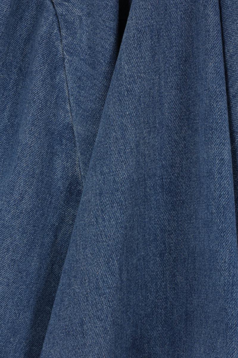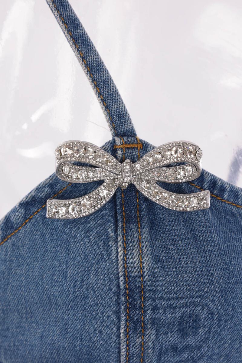 Self-Portrait mini dress made of blue cotton denim with metal bows embellished with crystals. Featuring a straight neckline, thin straps, a back zip closure, concealed pockets, and a flared skirt.