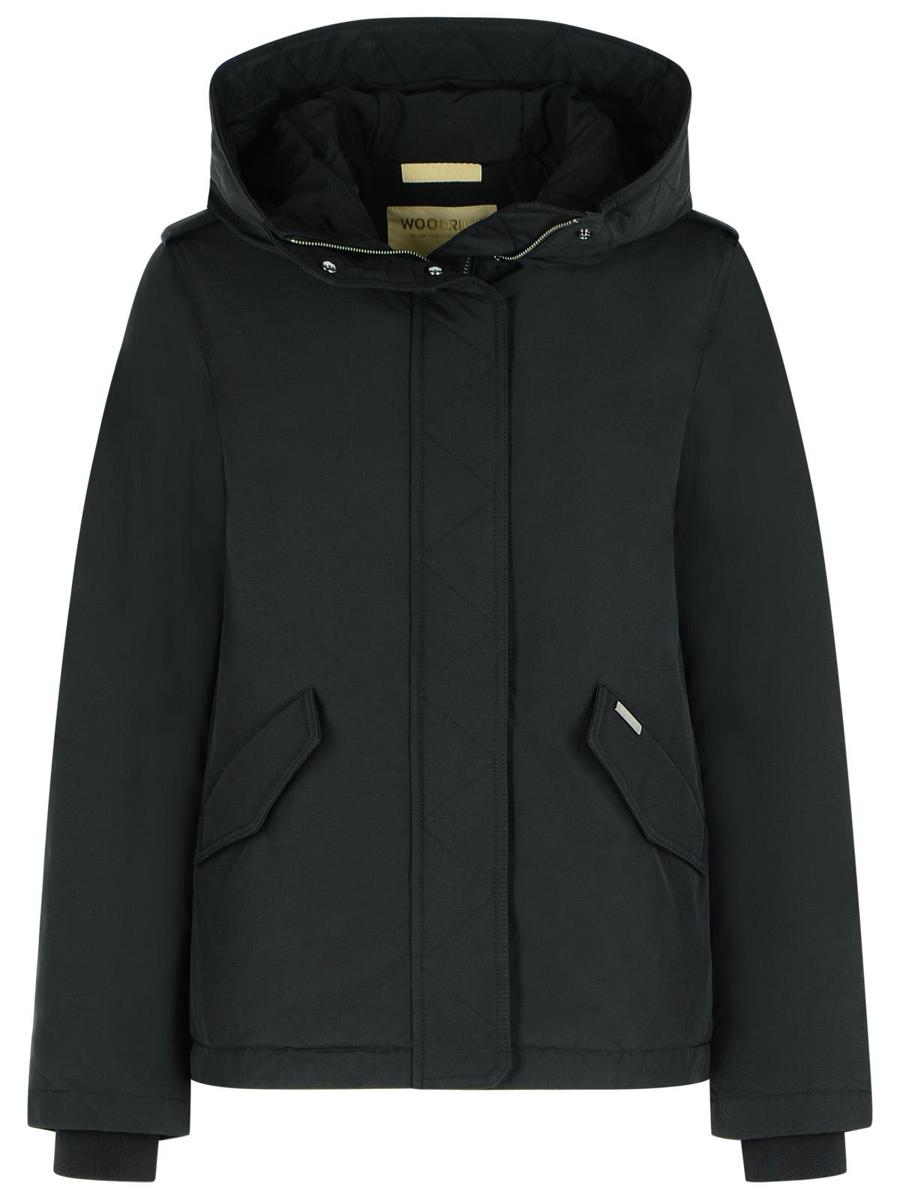Made of water-repellent and windproof fabric, 70/30 duck feather padding, hidden zip closure, adjustable waist, side welt pockets, inner zip pocket, ribbed cuffs, metal logo tag on the pocket, side label