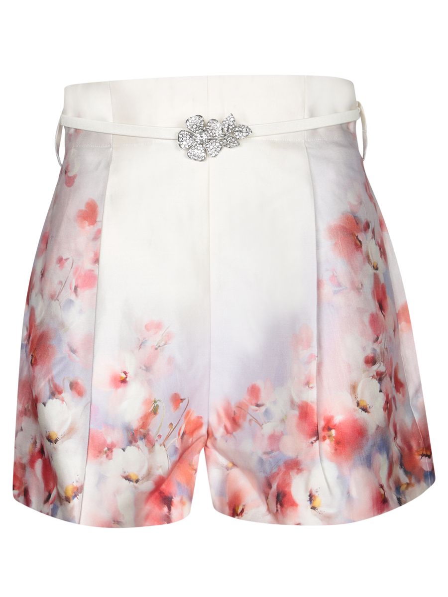 High-waist with invisible hook closure. Rhinestone embellishment on the side. All-over floral pattern.. Crafted by the renowned brand ZIMMERMANN, these stylish shorts portray modern femininity with a delicate floral print and a side sparkling detail