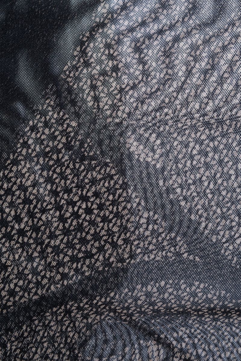 Balenciaga Trompe Oeil Lingerie Black Polyamide Top. Crafted from light beige stretch fine mesh, standing collar, long sleeves, printed black lingerie top on the front and back, straight hem, slim fit.
