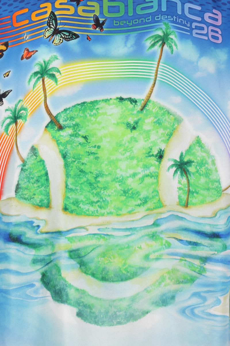 Casablanca bowling shirt crafted in silk twill with all-over graphic print. Features a notched collar, concealed front button closure, short sleeves, and a straight hem.