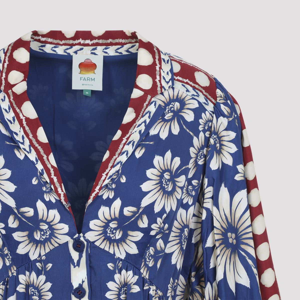 Farm Rio Luna Blue Viscose Mini Dress. Crafted from blue viscose, it features an all-over floral print with contrasting red printed details, a notched collar with a v-neckline, front button fastening, long balloon sleeves with buttoned cuffs, and a flounced hem.