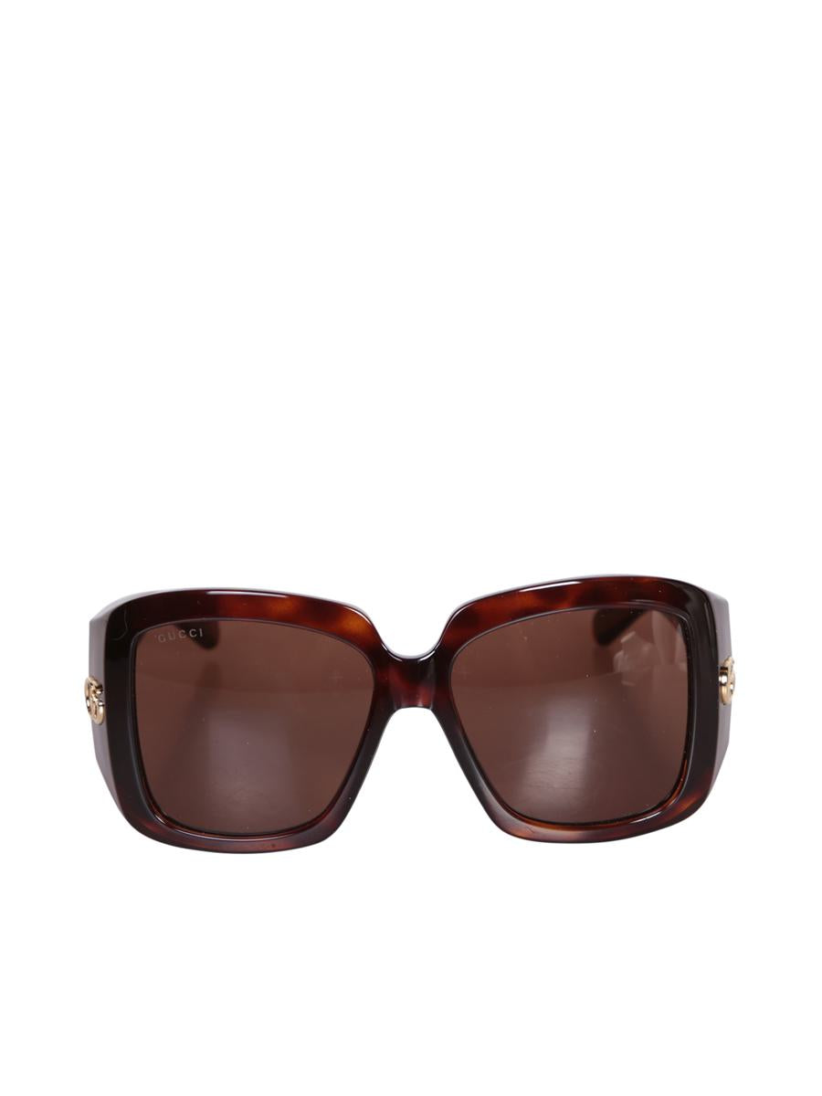 Tortoiseshell pattern adorns these sunglasses by Gucci. Shiny tortoiseshell injection frame. Shiny tortoiseshell injection temples. GG logo on the side. Solid brown lens. 100% UVA/UVB protection. Color: brown/ multicolor
