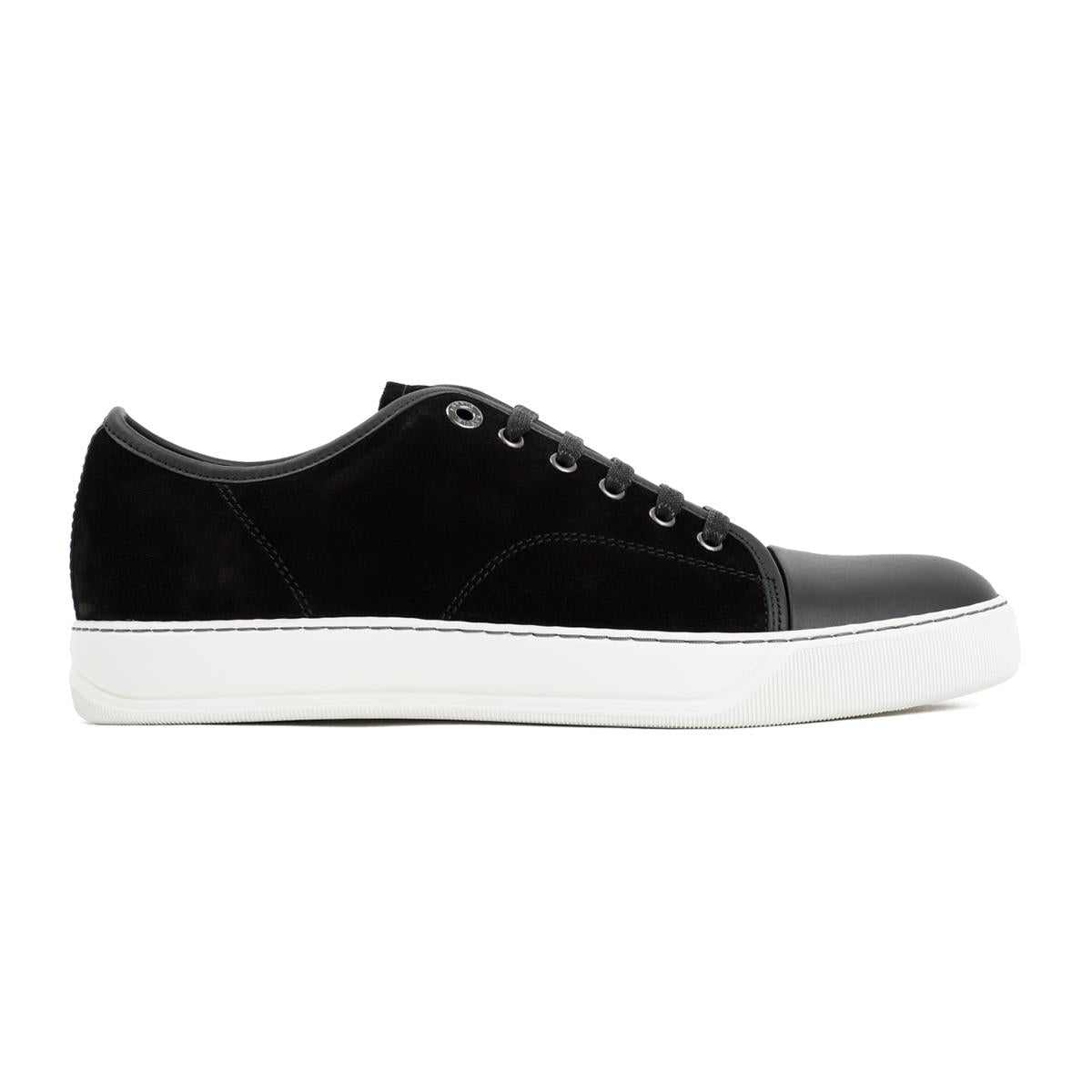 Lanvin Suede and Nappa Captoe Low To Black Calf Leather Sneakers. Black calf leather suede, rounded toe with tonal leather insert, lace-up fastening, tonal stitching, white rubber outsole.
