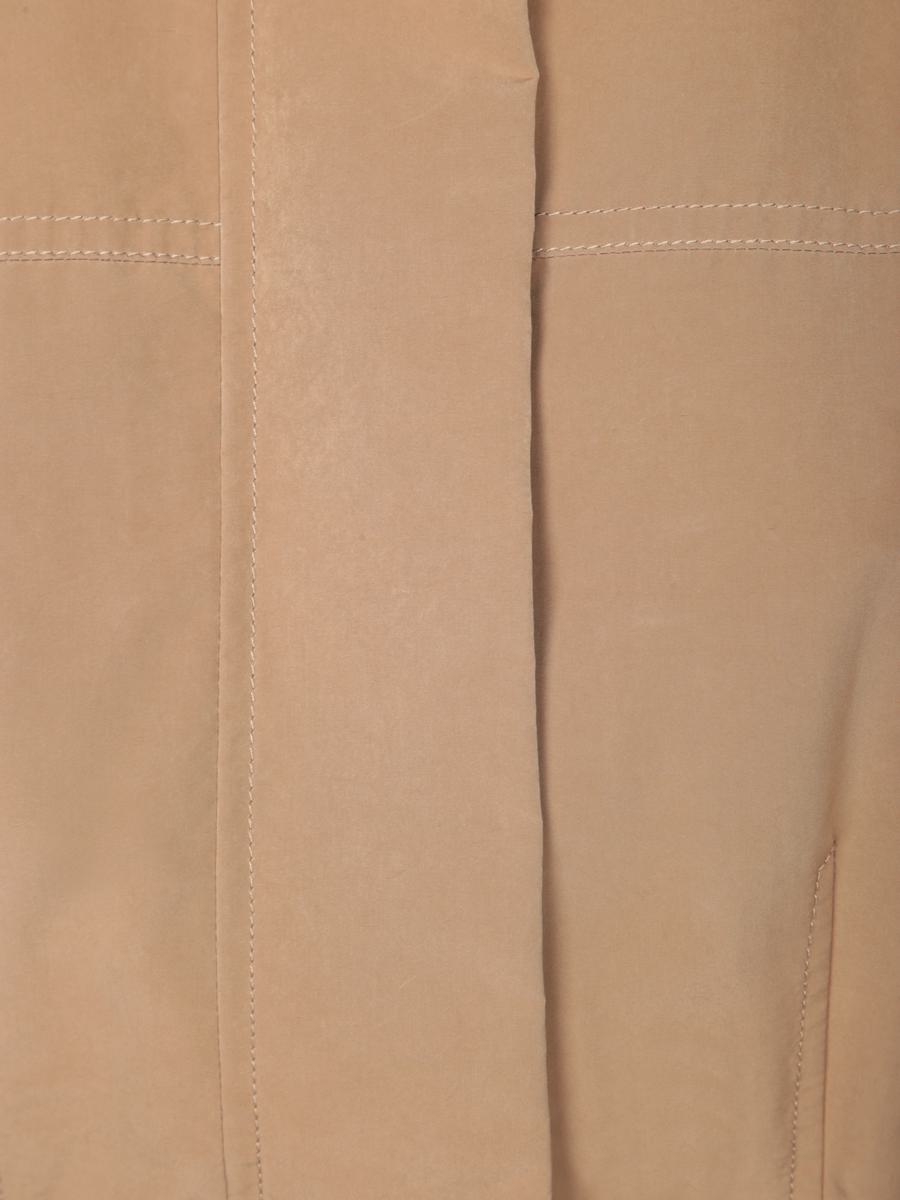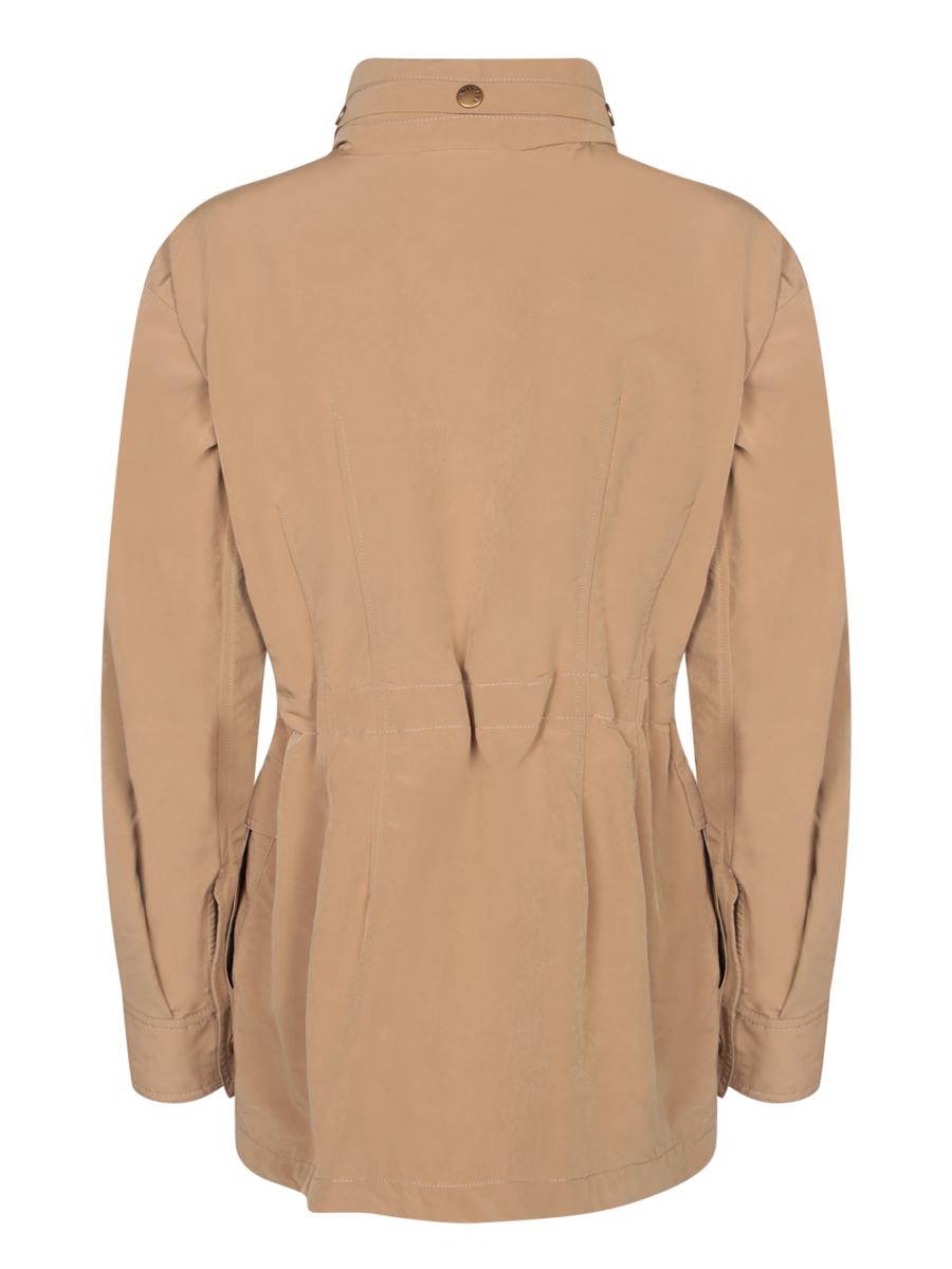 Short parka with hood. Flap pockets. Front button closure.. This sand-colored Moncler parka offers a sleek design with a functional twist. Perfect for outdoor wear, it features practical flap pockets and a convenient button closure