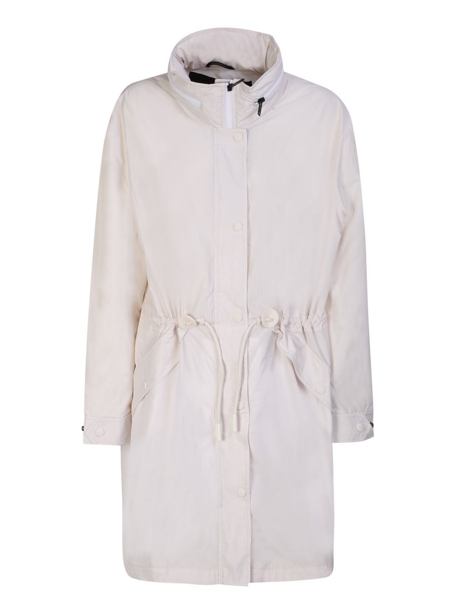High neck. Front zip and button fastening. Adjustable drawstring waistband. Long sleeves. Adjustable cuffs. Two side flap pockets. Detachable hood. Logo patch to the sleeve. Color: cream