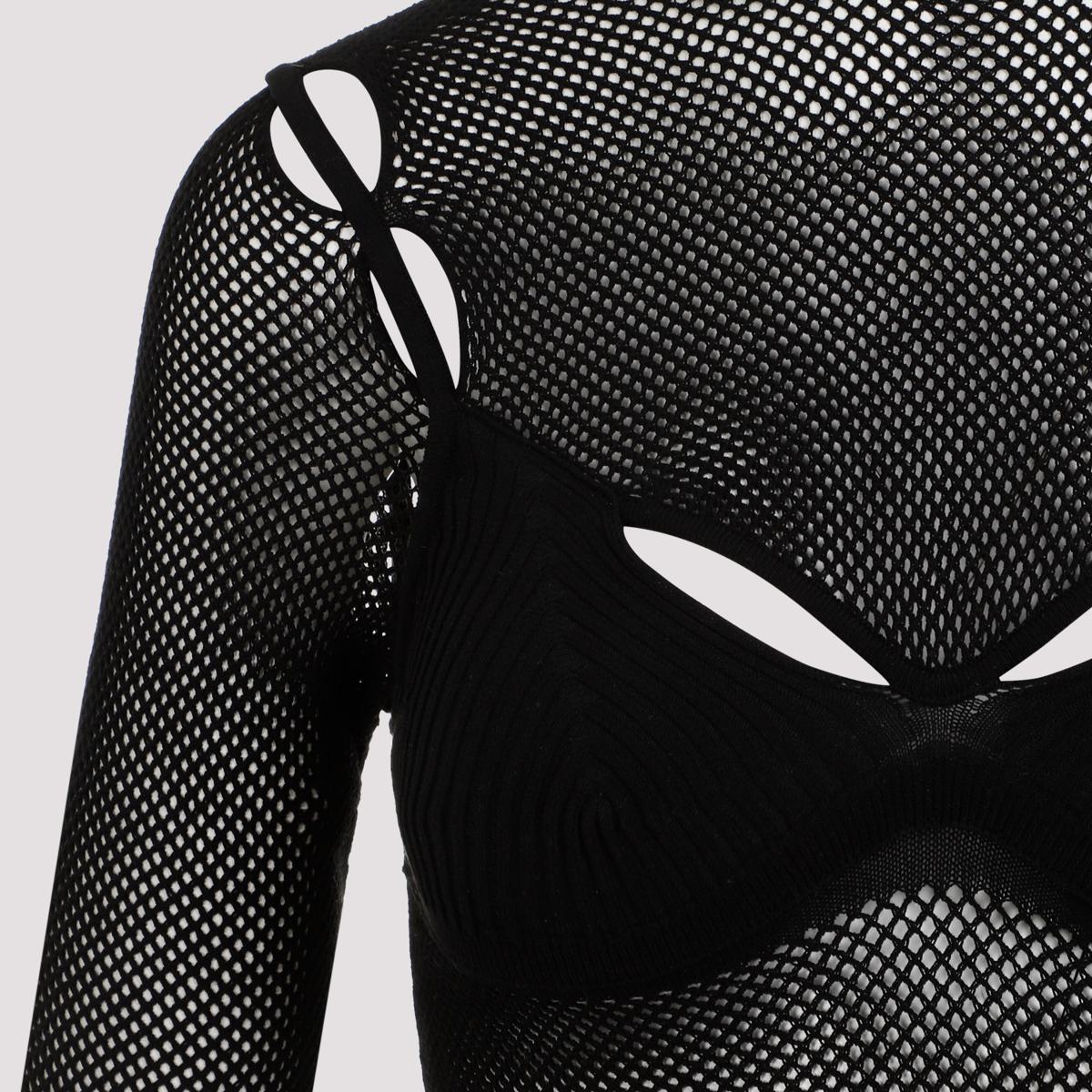 Off White Net Arrow Bralette Black Viscose Top. Black mesh, round neckline, cut-out details, layered effect with strapped bra, long sleeves, straight hem, ribbed edges.