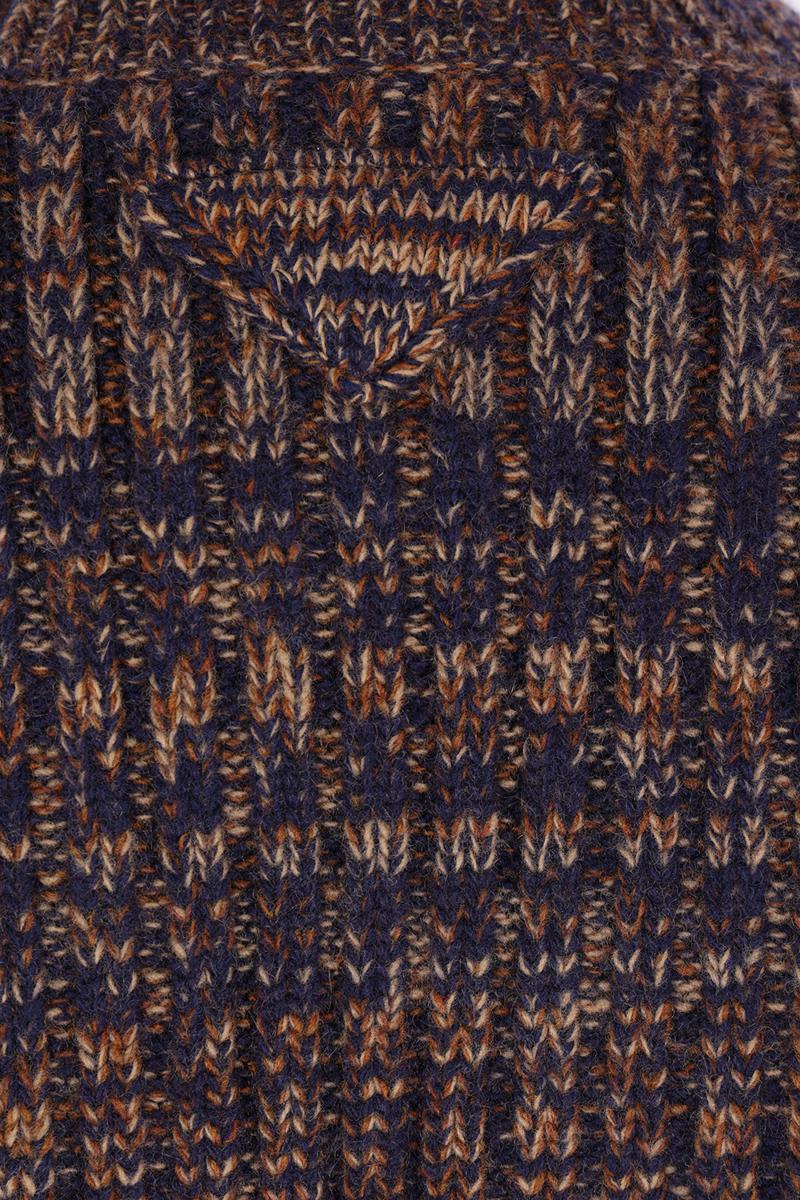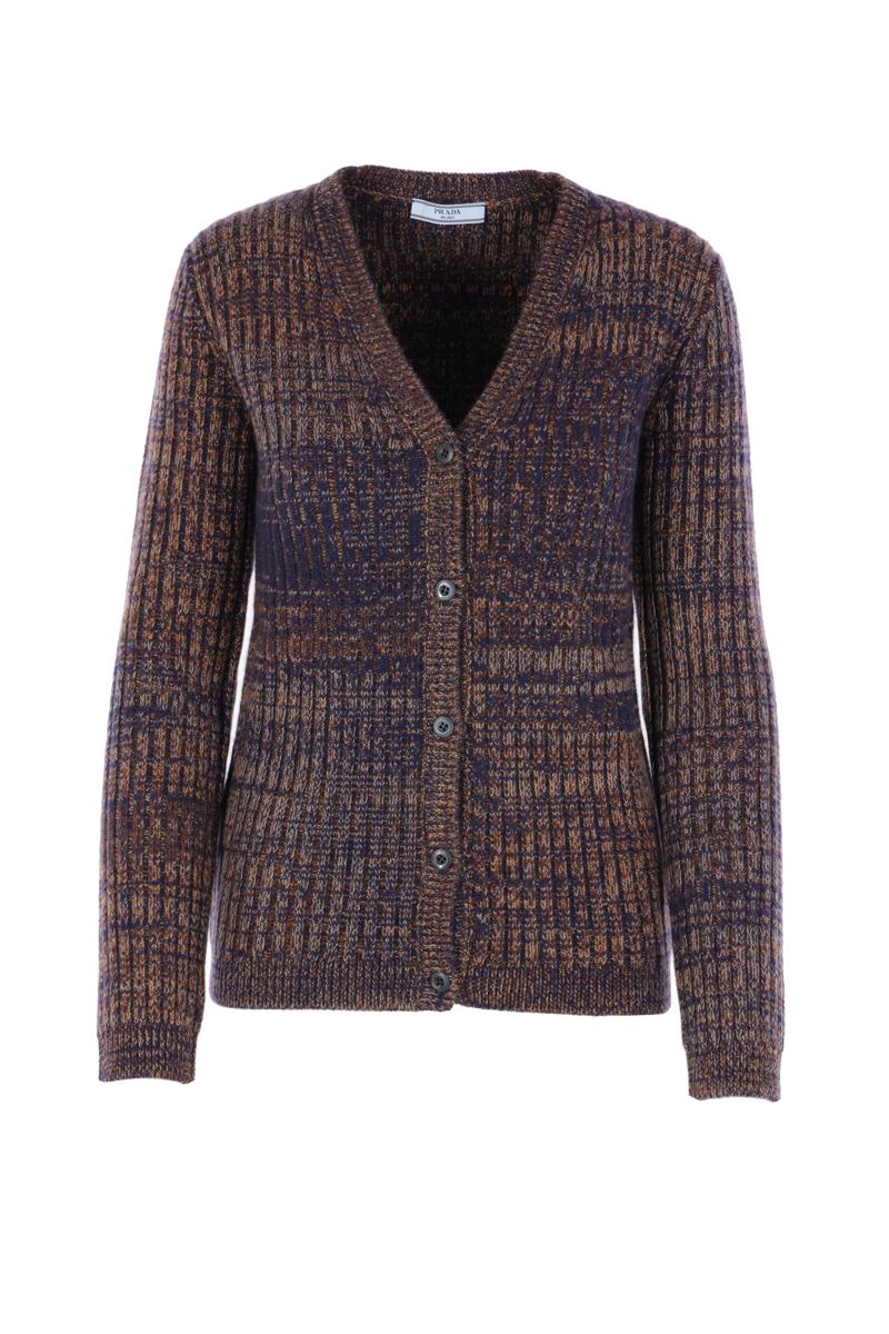 Prada cardigan crafted from blue and rust-toned wool and cashmere mouliné. Featuring a V-neckline, button closure, long sleeves, ribbed edges, and a straight hem. The design is completed with a triangular patch applied on the back.