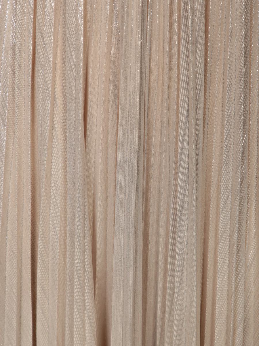Sleeveless glitter fabric dress with front draping and sweetheart neckline. Full-length with flowing pleats.