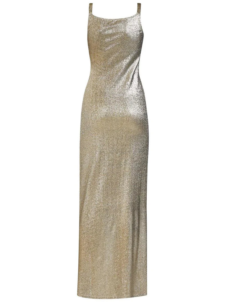 Rabanne’s Long Draped Dress offers a stunning example of how metallics can look both sophisticated and effortless. Its asymmetrical draping and button detailing add a touch of modern edge to the timeless glamour of metallic fabrics.