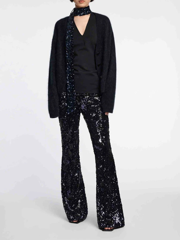 Another excellent option comes from Dorothee Schumacher with their Shimmering Attraction Sequin Pants. These eye-catching wide-leg pants bring a bold and modern twist to traditional sequins. Perfect for pairing with a sleek black blouse or blazer, they offer a chic alternative to dresses, ideal for those who want to make a statement while staying comfortable.
