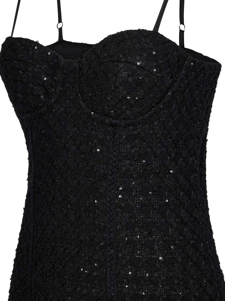 Rotate Birger Christensen, known for its contemporary, playful approach to partywear. Their Bouclé Midi Dress combines classic elegance with a modern twist, featuring subtle sequins woven into a bouclé fabric. It’s a versatile option that can transition from formal gatherings to more relaxed events.