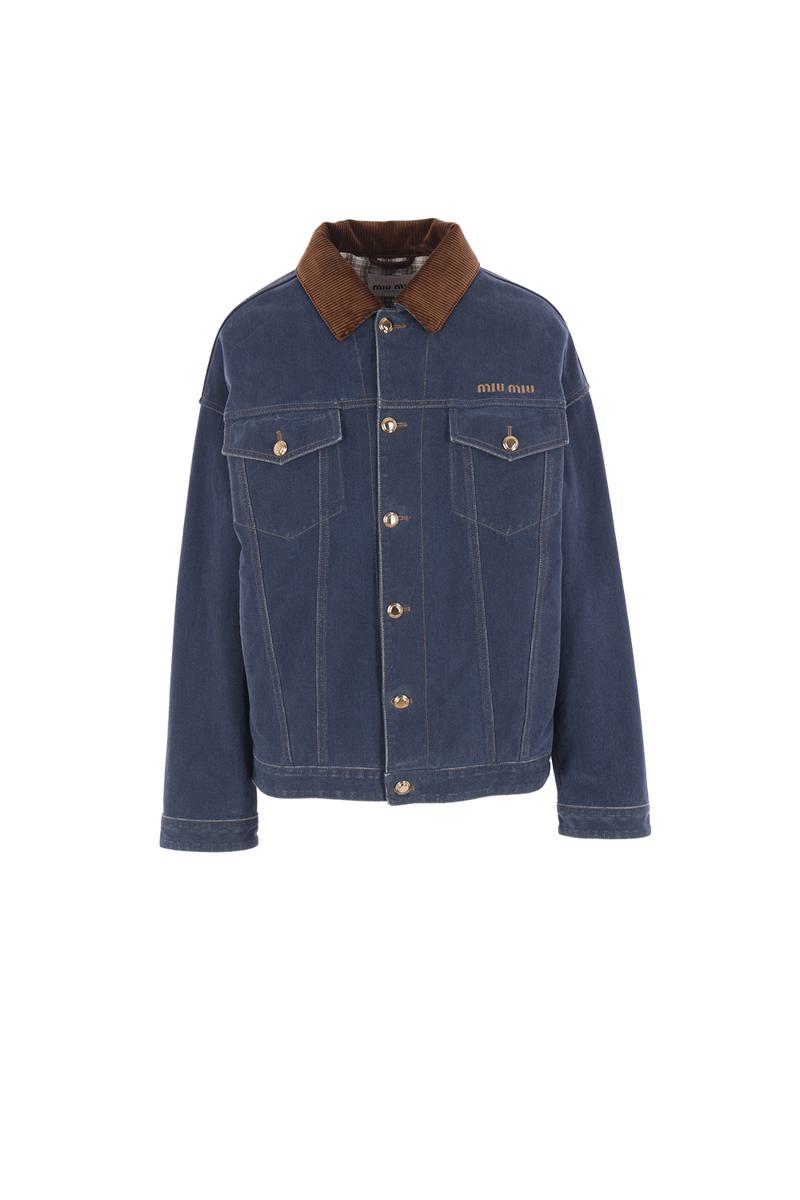 Miu Miu oversized padded jacket made of washed blue cotton denim with embroidered logo lettering on the chest. Featuring a pointed brown corduroy collar, front closure with metal buttons, multiple pockets, long sleeves with buttoned cuffs, and a straight hem with adjustable side tabs. The interior is lined in a cotton blend with a check pattern.