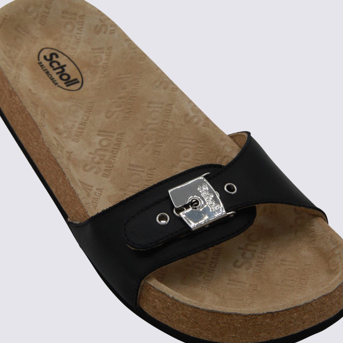 Black Scholl flats from Balenciaga featuring round toe, open toe, silver tone detail and open back.