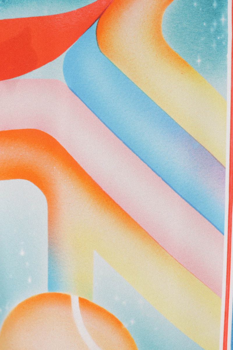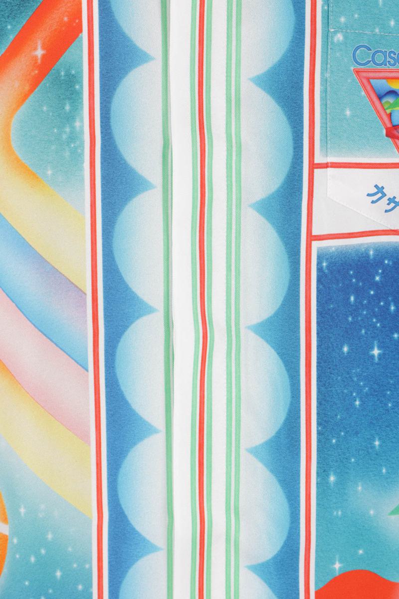 Casablanca bowling shirt crafted from multicolored silk twill with all-over Galaxy Court print. Featuring a cuban collar, concealed front button closure, chest patch pocket, short sleeves, and a straight hem.