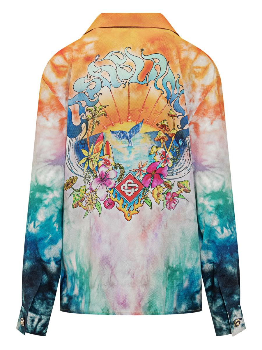 The Surf Trip long-sleeve silk shirt is a printed design crafted from silk fabric featuring seasonal artwork inspired by vintage Malibu surf culture using typography from that era, on a tie-dye backdrop referencing hippy culture. Completed with a Cuban collar, hidden button closure, interlocking CC logo corozo buttons, and gold rim enamel buttons on the cuffs