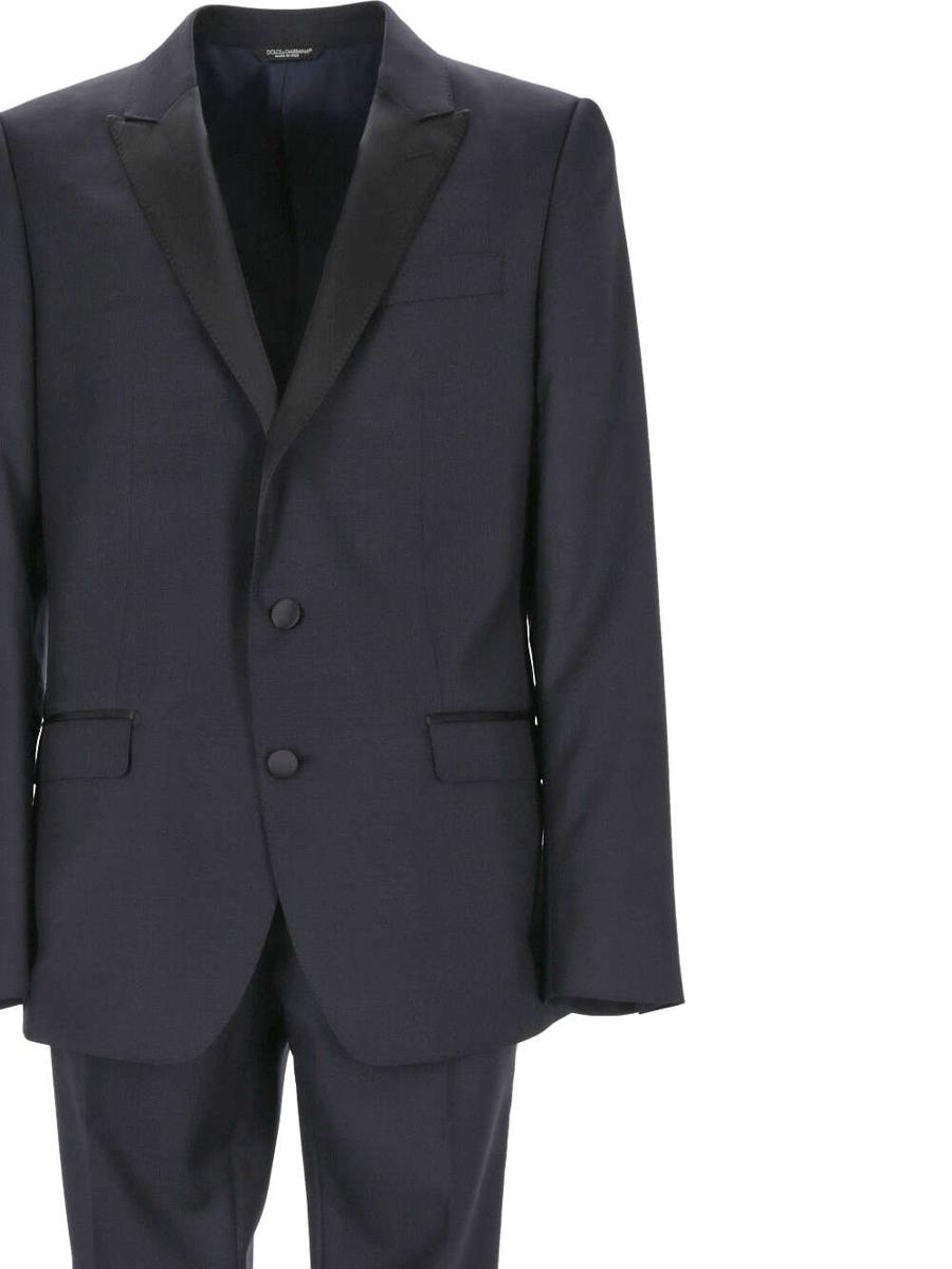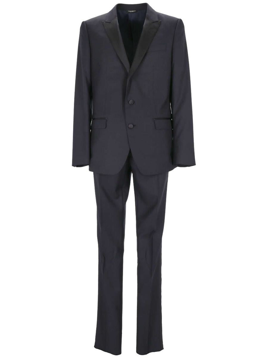 black virgin wool blend Jacket: contrasting lapels notched lapels front button fastening chest welt pocket two front flap pockets long sleeves buttoned cuffs central rear vent straight hem Trousers: slim leg pressed crease button fly fastening belt loops two side slit pockets two rear welt pockets ankle-length