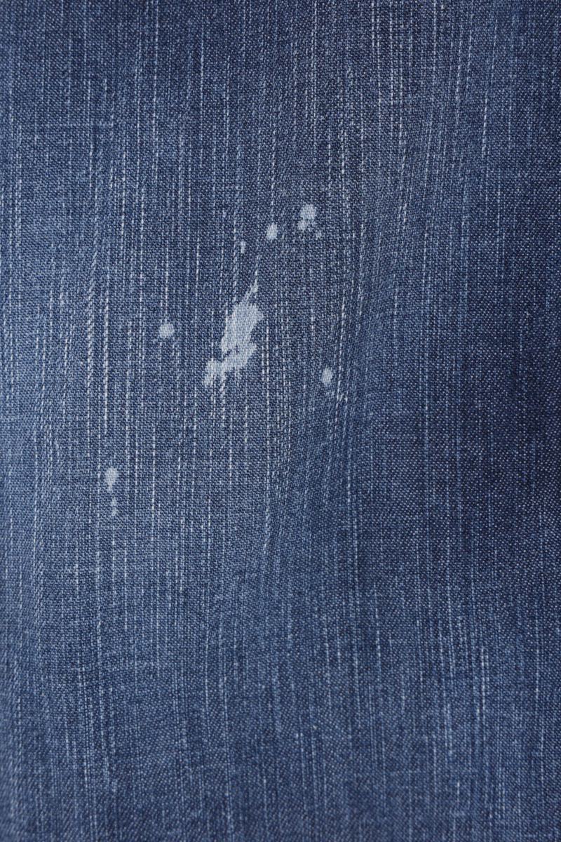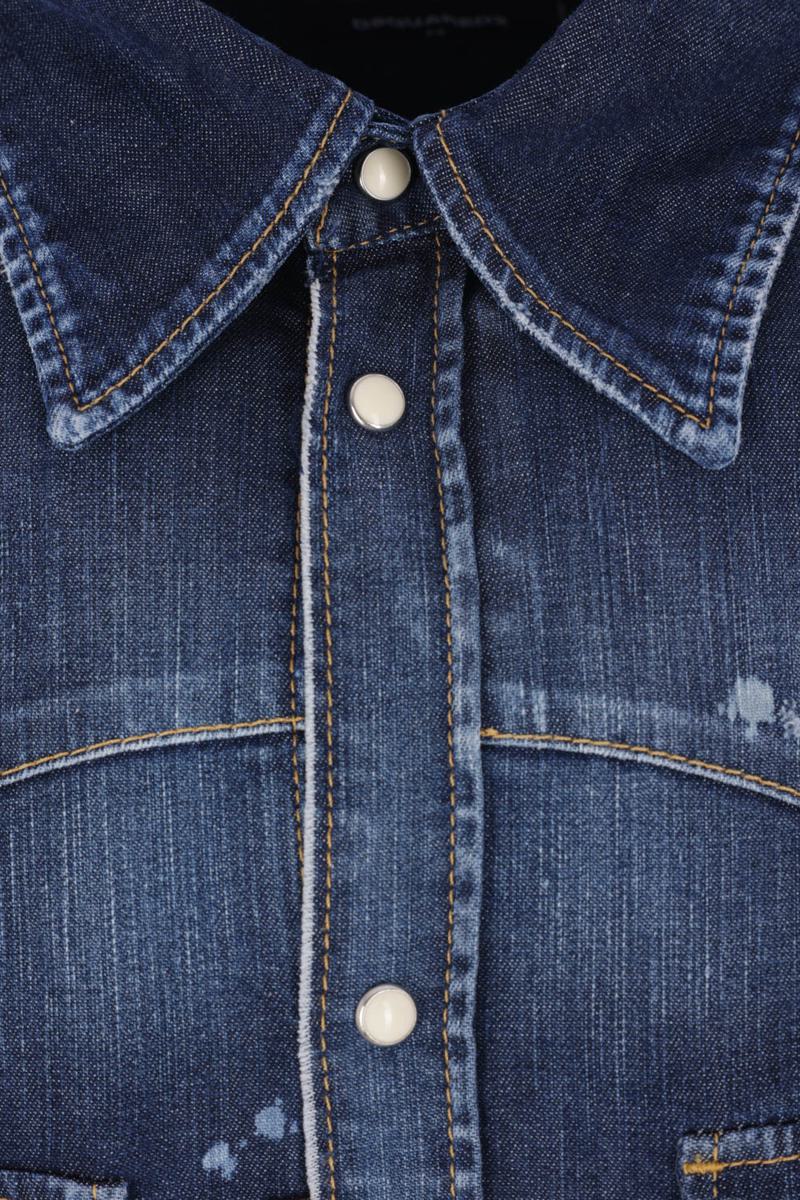 Dsquared2 shirt crafted from blue stretch cotton denim with a distressed finish and paint splatter details. Featuring a classic collar, front snap-button closure, flap pockets on the chest, long sleeves with buttoned cuffs, and a rounded hem.