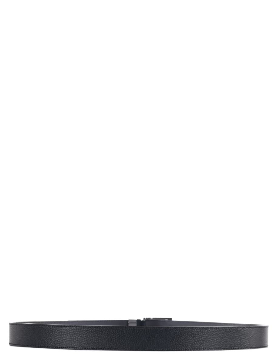 Emporio Armani reversible black/brown leather belt. Gunmetal metal buckle. Logo lettering on the buckle. Width: 35 mm. Adjustable.