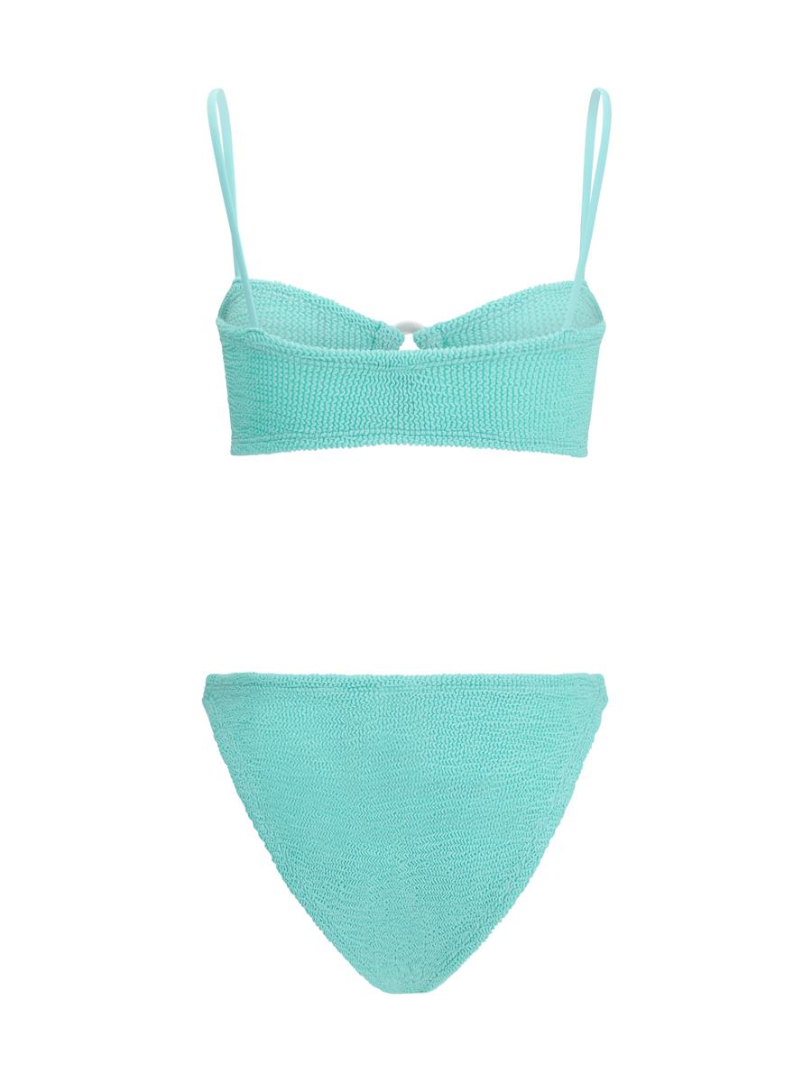THE MISTY SWIMSUIT BY HUNZA G IS IDEAL FOR THOSE SEEKING A SOPHISTICATED, MODERN LOOK. THE BIKINI STYLE CONSISTS OF A LOW-RISE BOTTOM AND A TOP WITH THIN STRAPS, ENHANCED BY A CUT-OUT DETAIL WITH A RING ON THE FRONT, WHICH ADDS A DISTINCTIVE STYLE TOUCH. THE UNIQUE ORIGINAL CRINKLE FABRICATION ALLOWS THE FABRIC TO STRETCH TO FLEX, SCULPT AND SUPPORT EVERY CURVE, FITTING ALL BODY TYPES PERFECTLY, ENSURING A UNIQUE FIT.