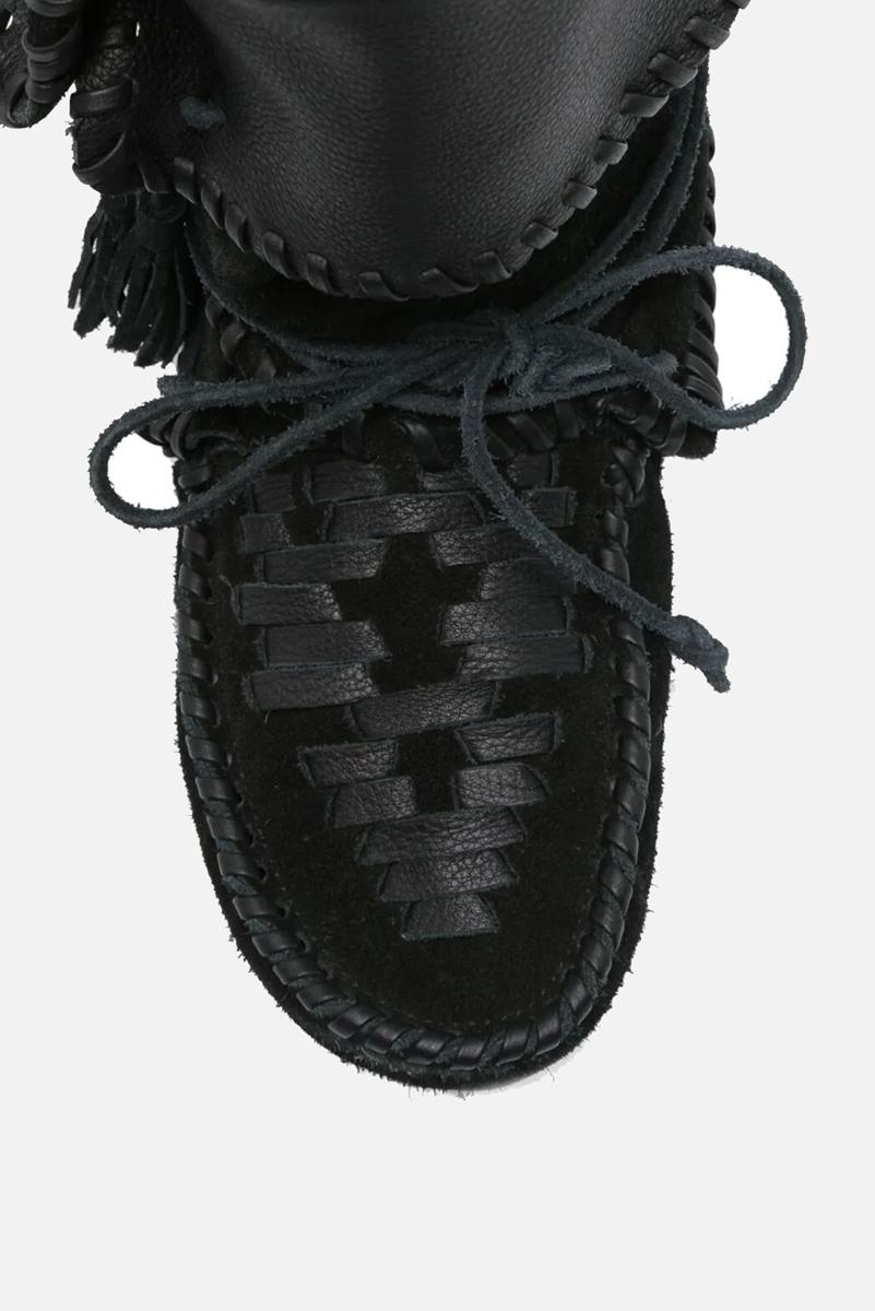 Isabel Marant boot made of black suede with interwoven graphic motifs. It features a rounded toe, wrap-around laces on the shaft, leather linings, and a leather sole. The design is completed with decorative tassels.