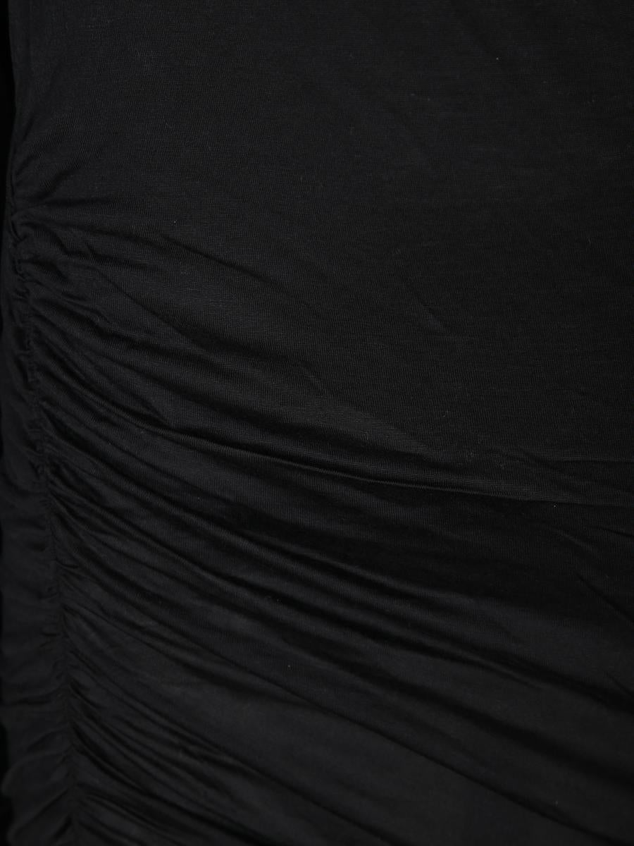 High collar. Long sleeve. Asymmetric design with side ruching.