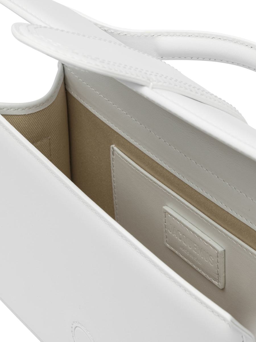 Jacquemus "Le grand Bambino" handbag made of leather with a smooth surface and rigid structure. The geometric silhouette features a small top handle and compact proportions. The construction features front flap with magnetic closure and defined edge. Jacquemus logo in gold finish is applied to the bottom of the flap. On the back, an integrated flat pocket adds function.