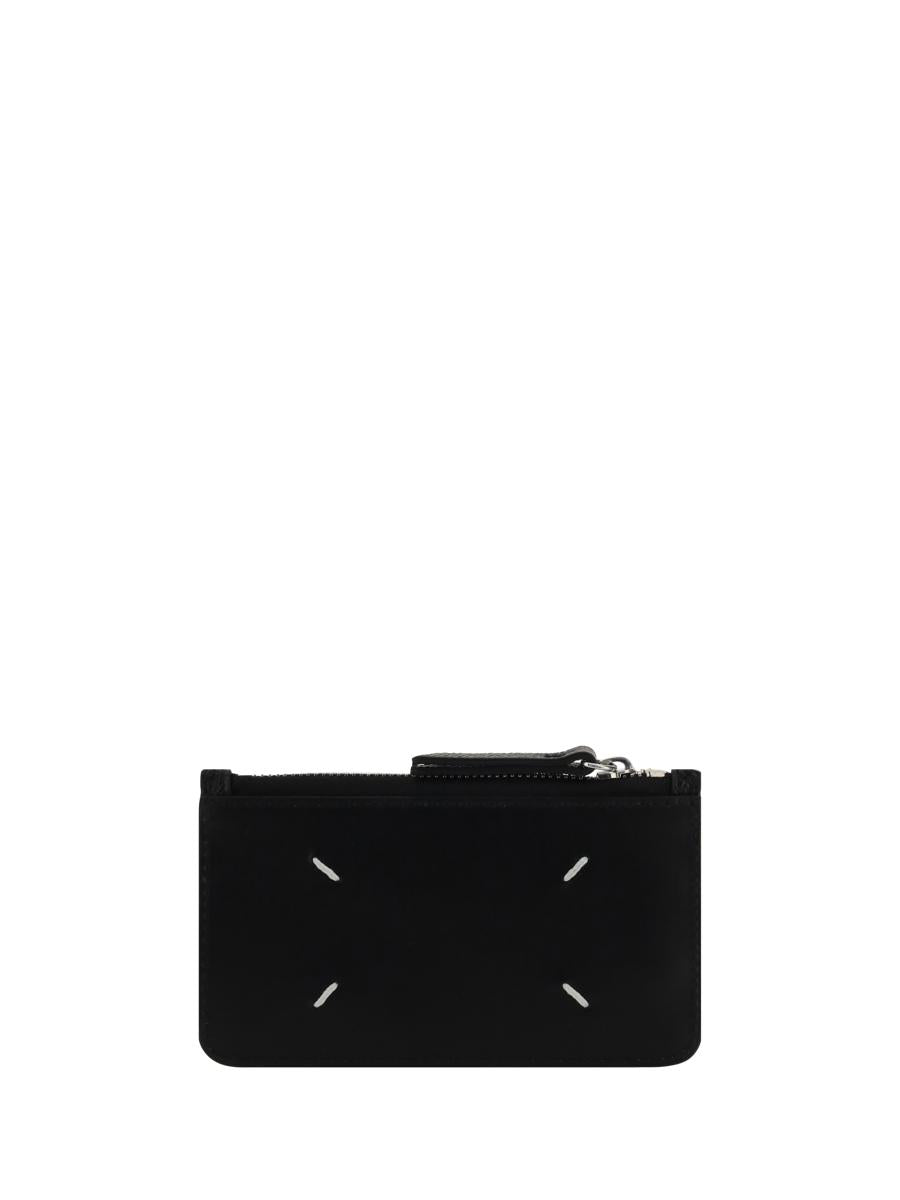 MAISON MARGIELA LEATHER CARD CASE, TOP ZIPPER CLOSURE, GRAINED LEATHER FRONT, SMOOTH LEATHER BACK WITH ICONIC CONTRASTING BRAND EMBROIDERY, CARD SLOT ON FRONT.