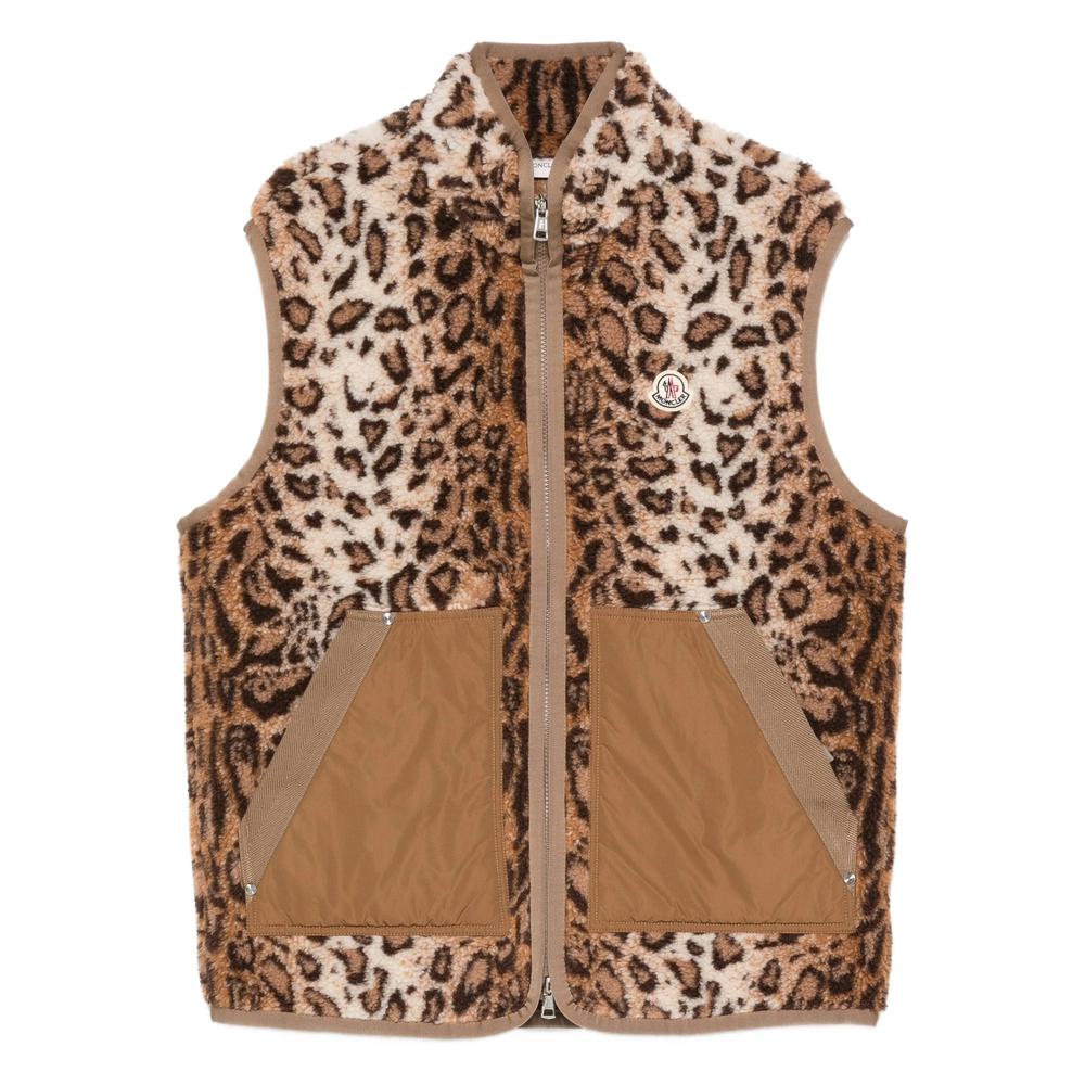 Light brown animal print chest logo patch zip fastening two front pockets sleeveless