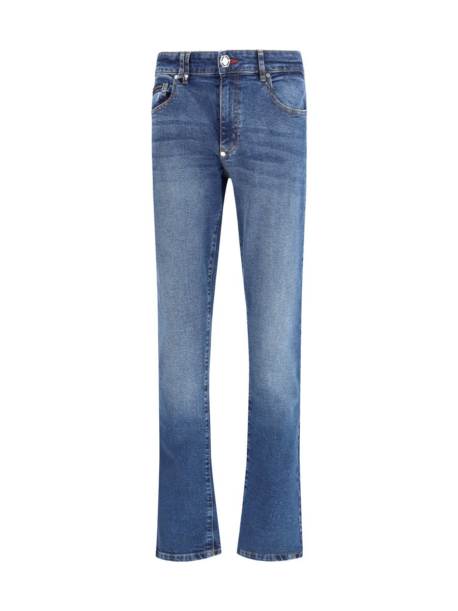 PHILIPP PLEIN'S SUPER STRAIGHT CUT JEANS REINTERPRET THE CLASSIC FIVE-POCKET STYLE WITH THE BRAND'S SIGNATURE BOLD CHARACTER. CRAFTED IN DENIM WITH A WORN EFFECT, THEY FEATURE A SEWN-ON LABEL ON THE BACK AND A METAL BUTTON-ADJUSTED STRAP. THE SUPER STRAIGHT FIT ENSURES A CLEAN, CONTEMPORARY SILHOUETTE, THE PERFECT EXPRESSION OF PLEIN'S BOLD, REFINED STYLE.