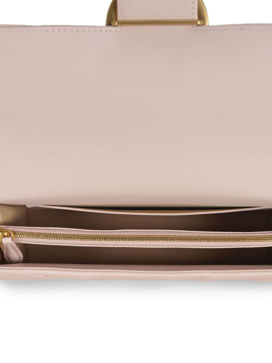 Bag Pinko "Mini Love" made of nappa leather in the color Powder Pink. Used effect. Closure with iconic "Love Birds Diamond Cut" buckle in gold metal, engraved "Pinko" writing. Interior lined in microfiber. Wall pocket. Bag with zipper. Shoulder strap combines round metal chain, shoulder strap in nappa leather. "Love Birds Diamond Cut" logo embroidered in tone on tone on the back. Measurements Height 16cm, Width 8cm, Length 27cm Lining