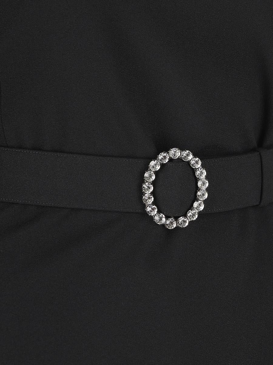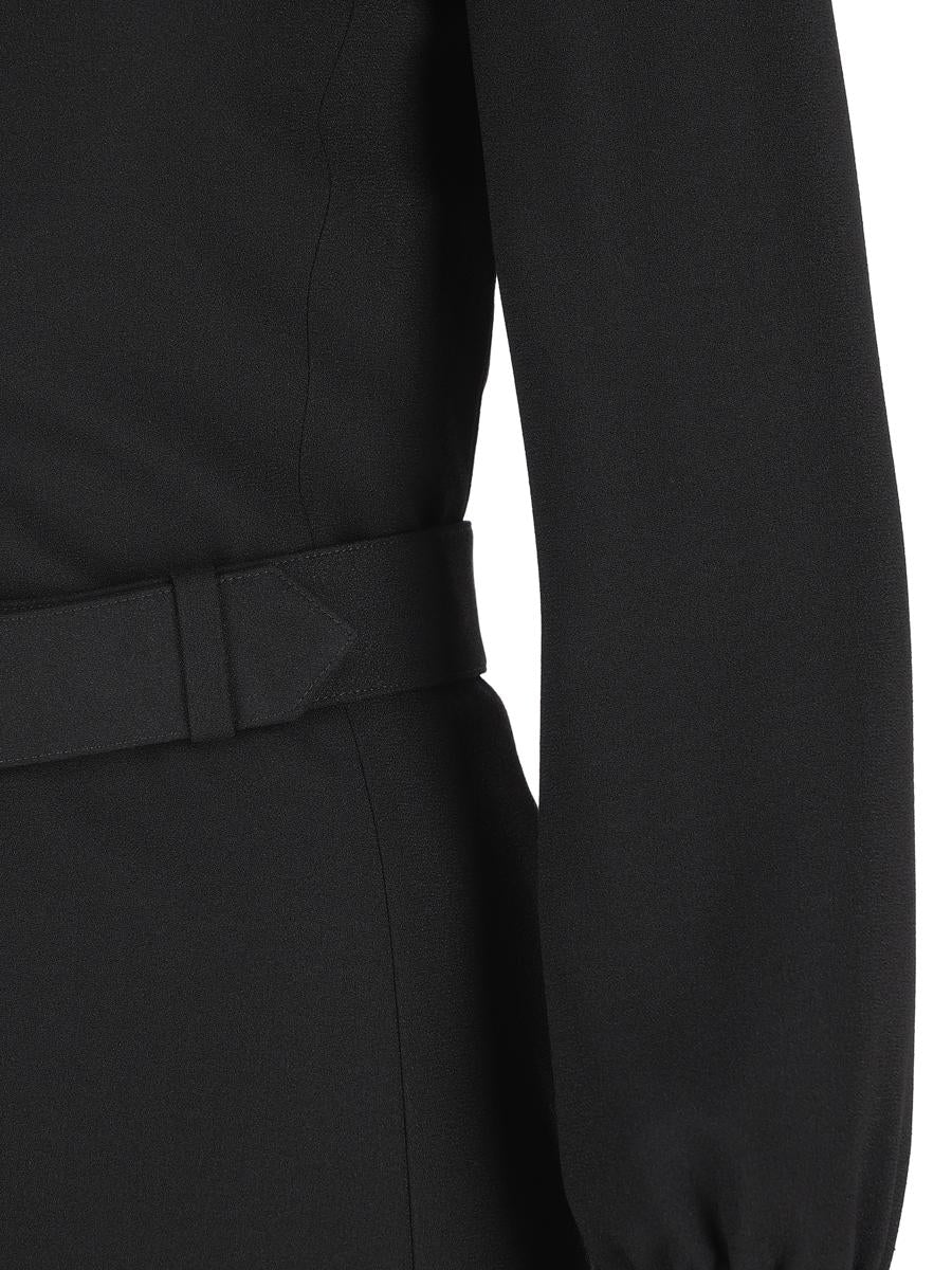 Essential lines and sophisticated sensuality define this mini dress by Saint Laurent. Made of fluid sablé, it stands out for its minimalist design enhanced by a deep back neckline. An elegant and bold garment designed for special evenings and occasions when every detail counts. - Material: 53% acetate, 47% viscose - Color: black - Viscose lining - Button closure on back of neck - Concealed zipper, hook and eye closure on back of skirt - Round neckline - Adjustable and detachable belt with oval buckle set with crystals - Padded shoulders - Made in Italy - Item number: 819619Y012W1000
