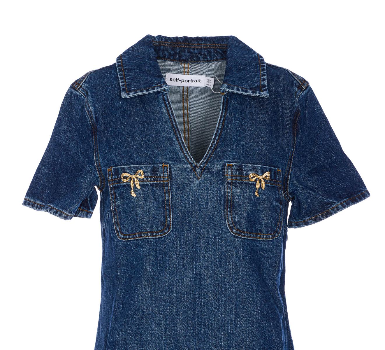 Swelf Portrait Blue Denim Crystal Bow Mini Dress, V-Neck, Short Sleeves, Regular Collar, Bow Detail, UK SIZE