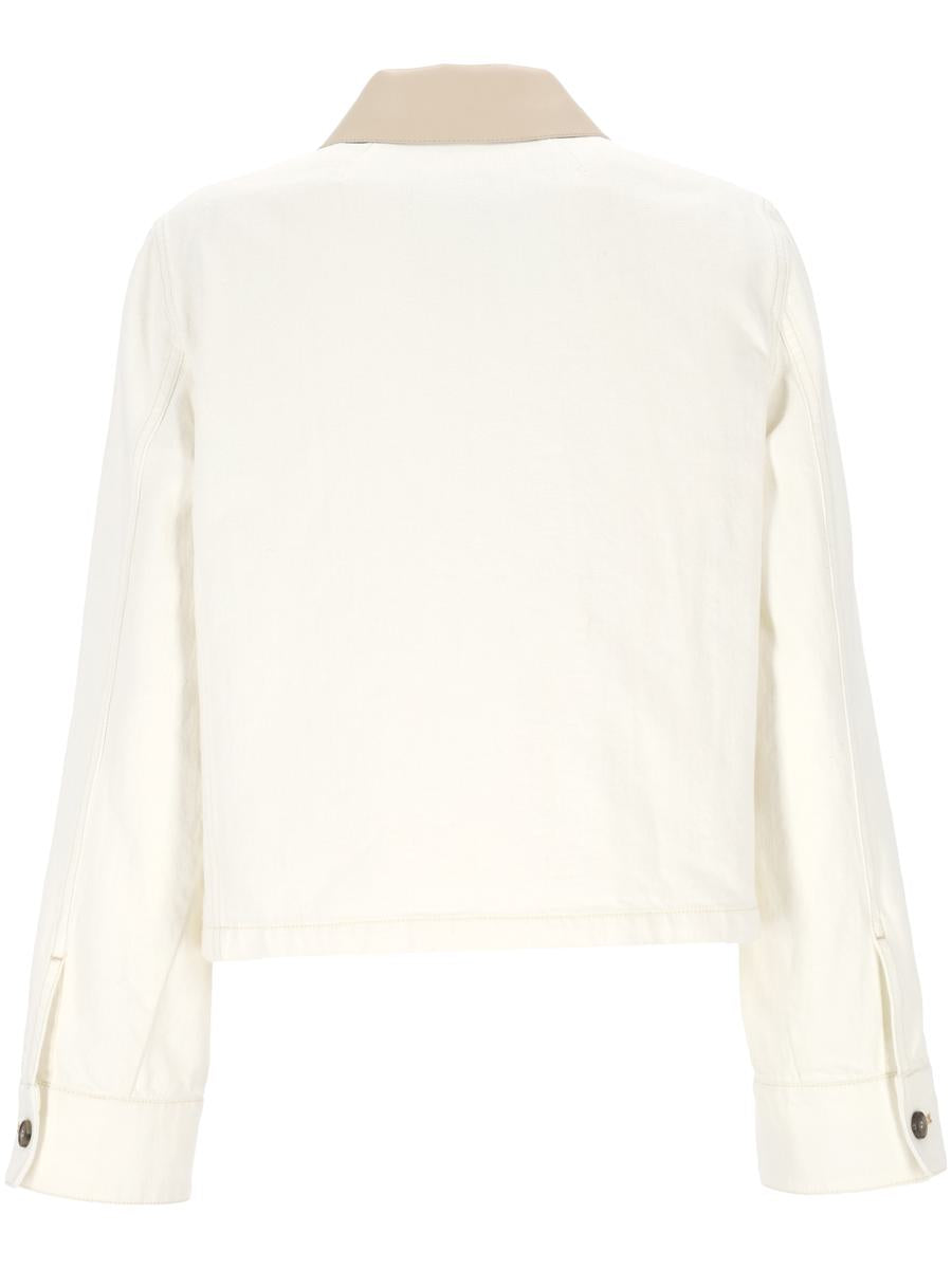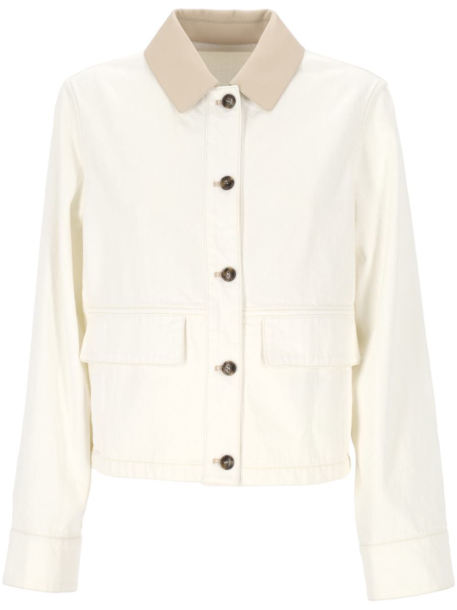 White front button fastening buttoned cuffs two side slit pockets contrasting collar